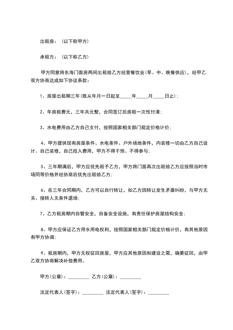 甲方同意将东海门面房两间出租给乙方经营餐饮业(早、中、晚餐供应),经甲乙双方协商达成如下协议条款: