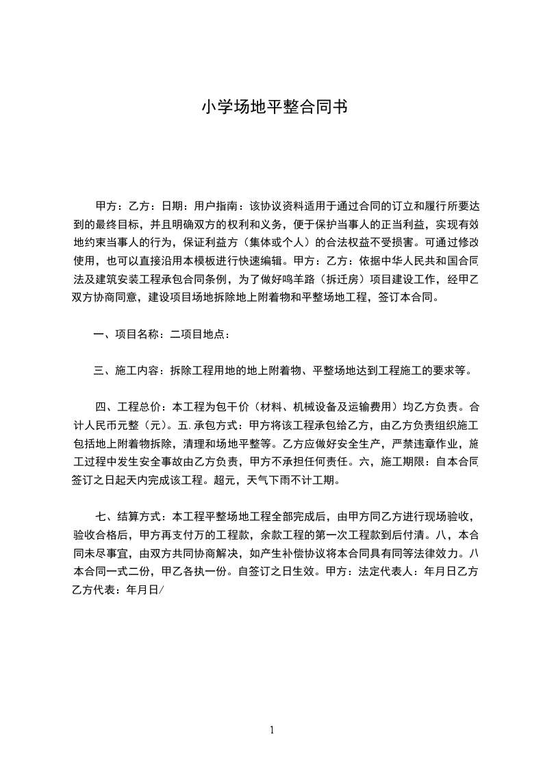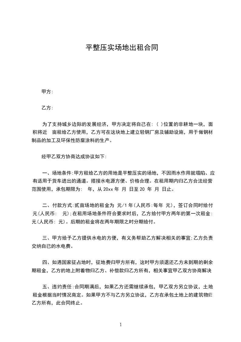 一、场地条件:甲方租给乙方的用地是平整压实的场地,不因雨水作用就塌陷、应有适用于货车进出的通道。搭接水电源方便、价格合理。在租用期内归乙方合法经营范围使用,承包期限为: 年,从20xx年 月 日至20 年 月 日止。