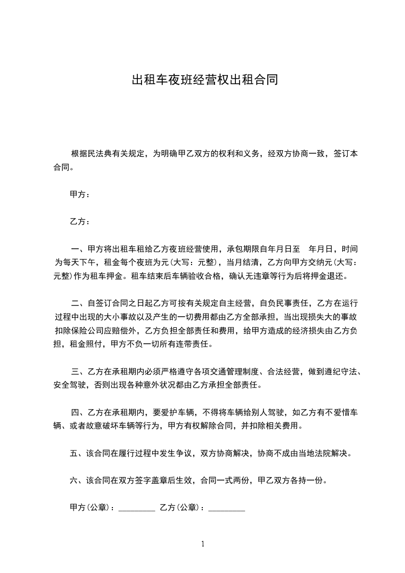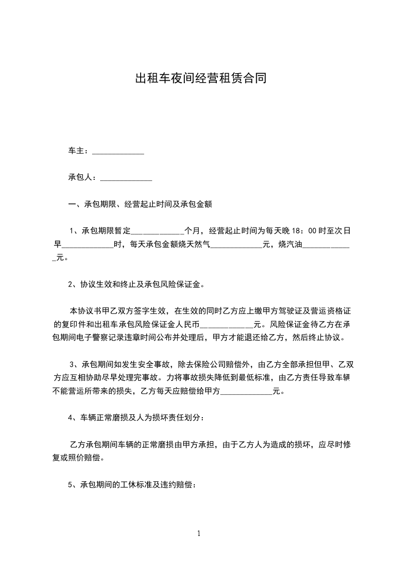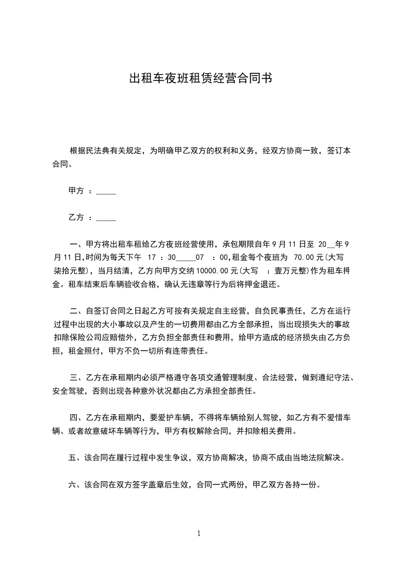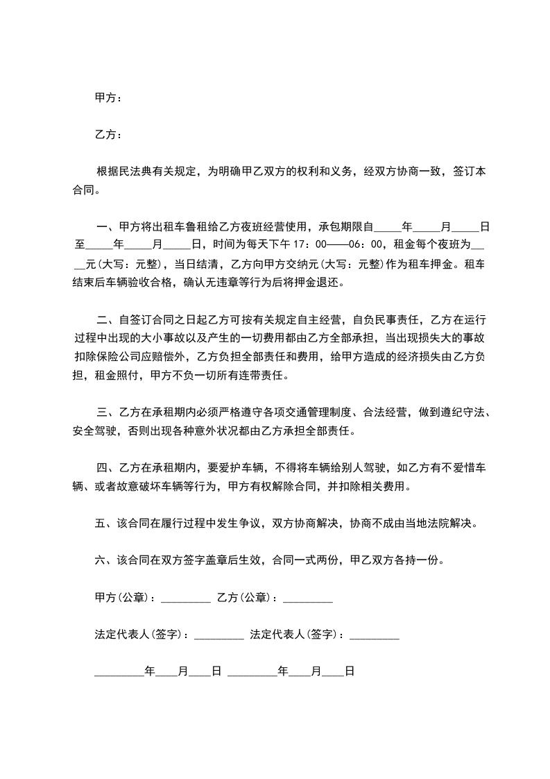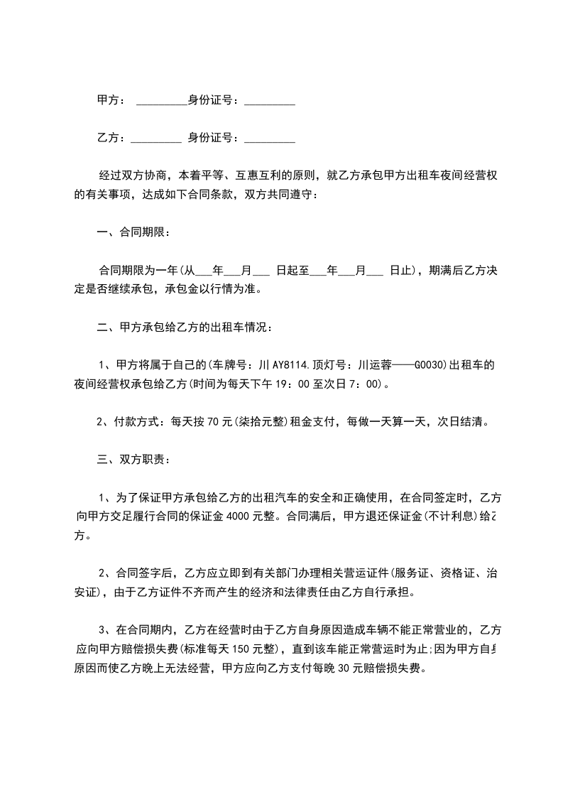一、甲方将出租车租给乙方夜班经营使用,承包期限自_____年_____月_____日至 _____年_____月_____日,时间为每天下午,租金每个夜班为_____元(大写:元整),当月结清,乙方向甲方交纳元(大写:元整)作为租车押金。租车结束后车辆验收合格,确认无违章等行为后将押金退还。