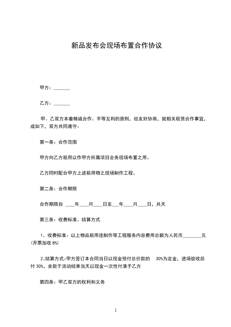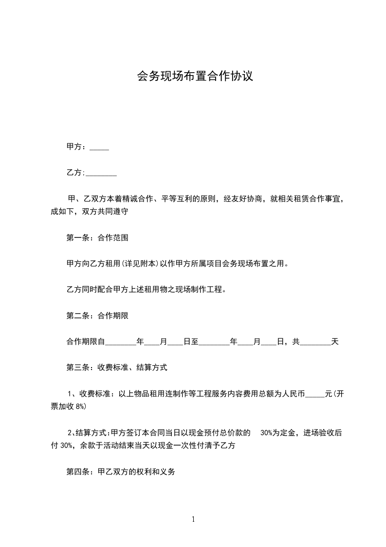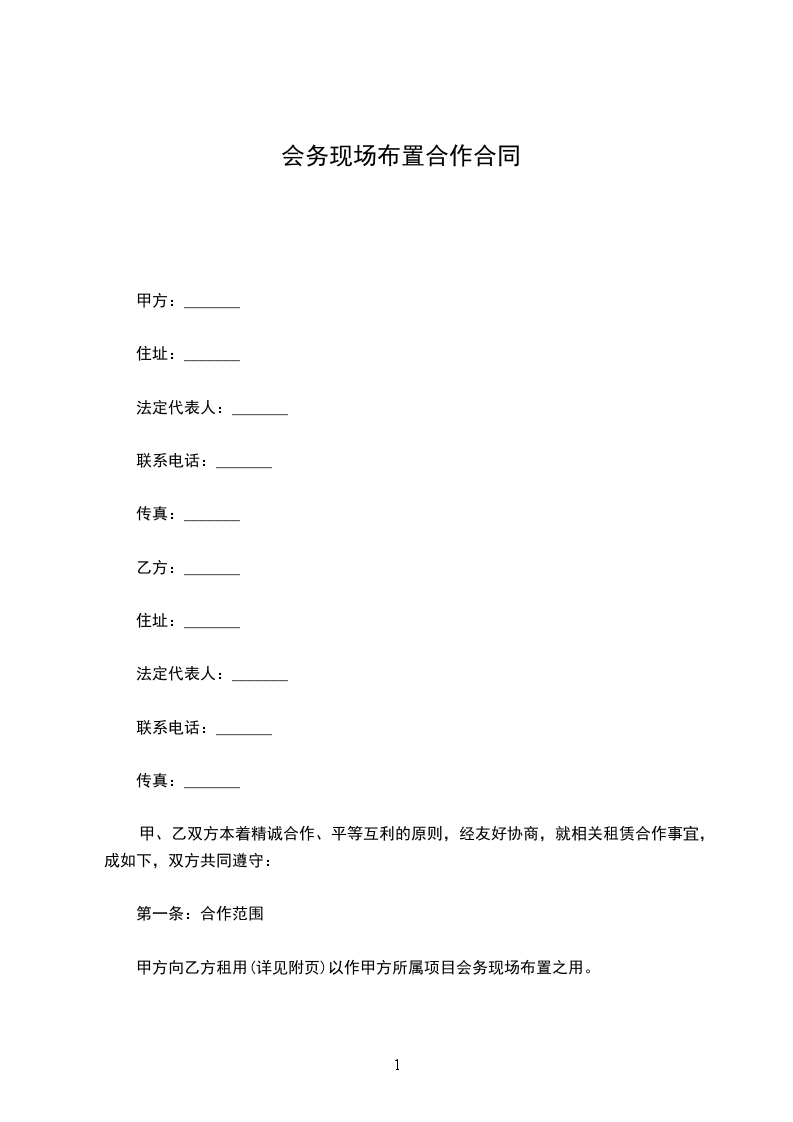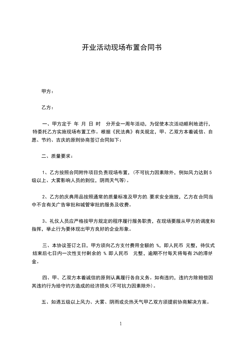 一、甲方定于 年 月 日 时 分开业一周年活动,为促使本次活动顺利地进行,特委托乙方实施现场布置工作。根据《民法典》有关规定,甲、乙双方本着诚信、自愿、节约、吉庆的原则协商签订合同如下: