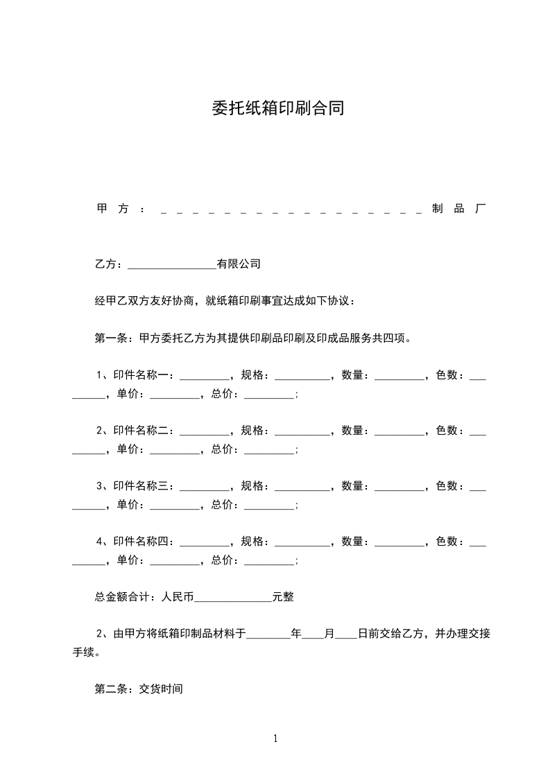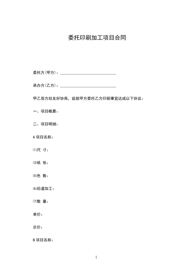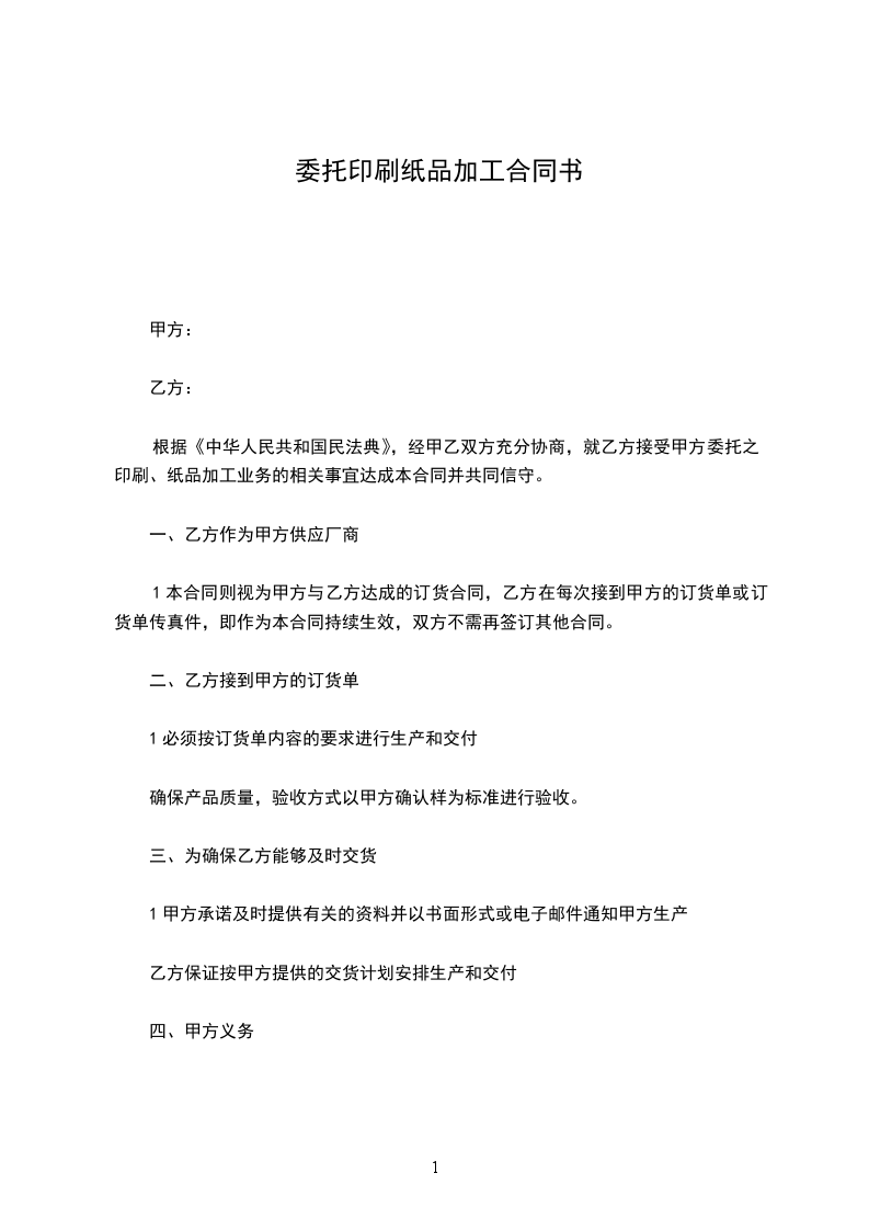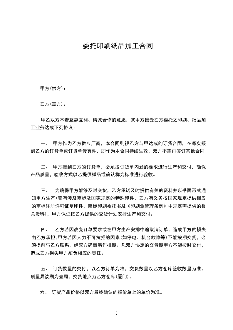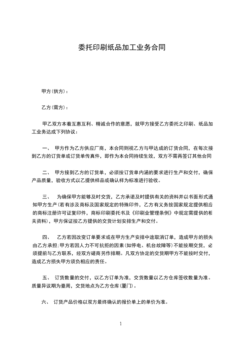 甲乙双方本着互惠互利、精诚合作的意愿,就甲方接受乙方委托之印刷、纸品加工业务达成下列协议: