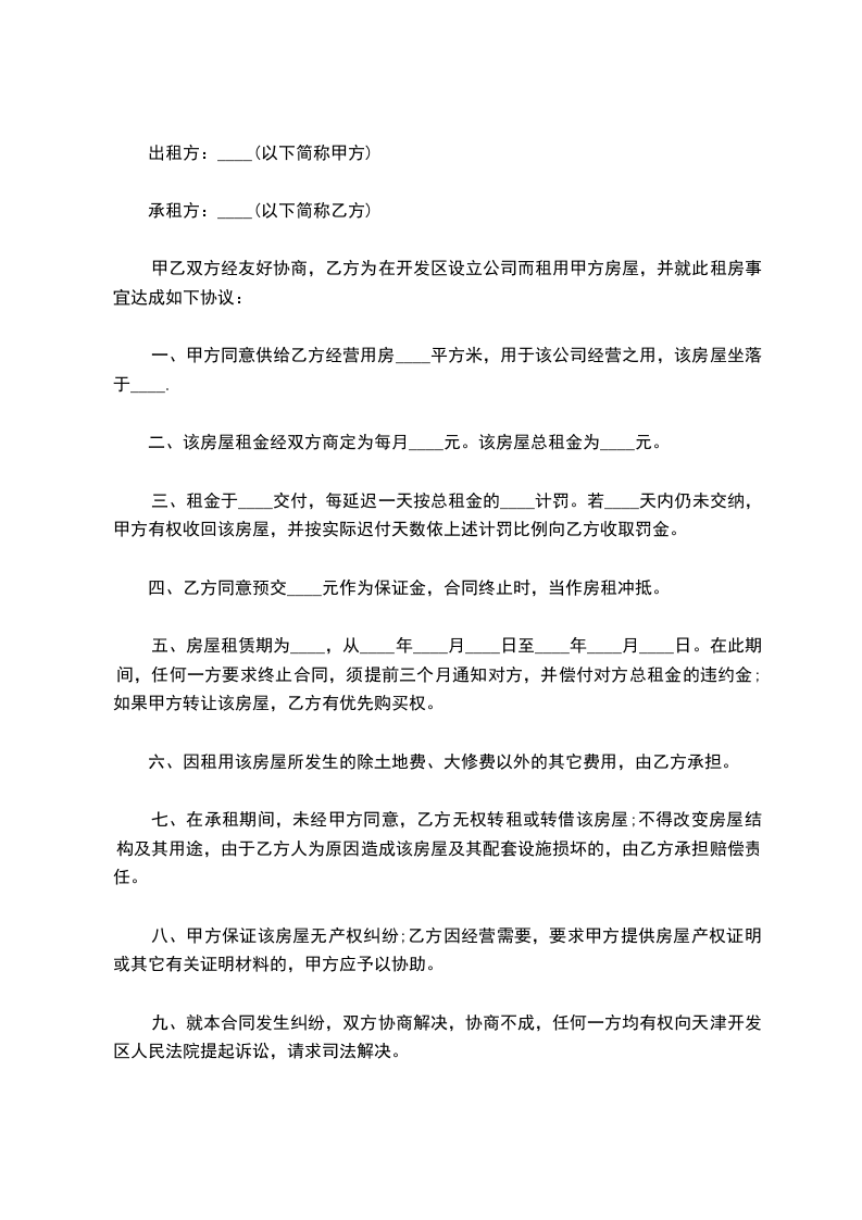 九、就本合同发生纠纷,双方协商解决,协商不成,任何一方均有权向天津开发区人民法院提起诉讼,请求司法解决。