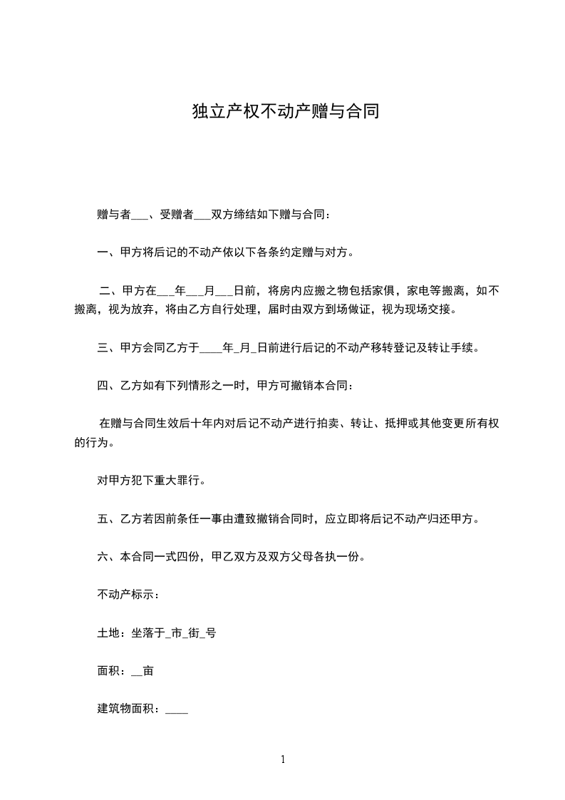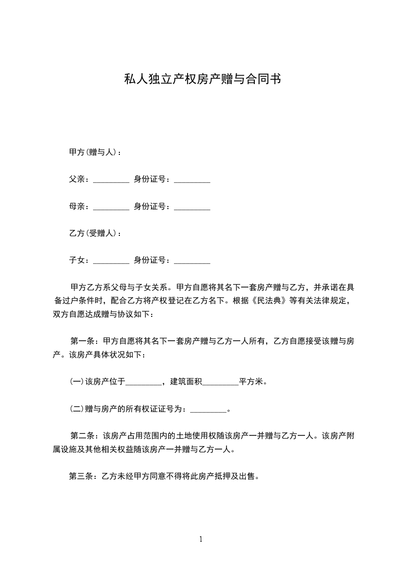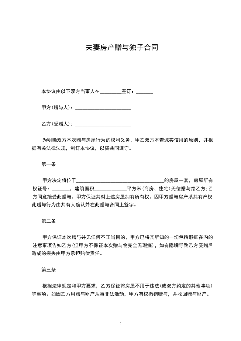 第一条:甲方自愿将其名下一套房产赠与乙方一人所有,乙方自愿接受该赠与房产。该房产具体状况如下: