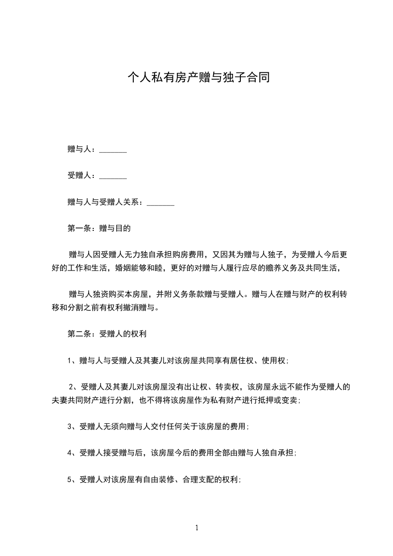 第四条:根据甲方的意愿,本合同签订后,若乙方结婚,甲方对乙方的一人赠与性质不变。乙方的妻子只享有居住权,没有房产所有权。