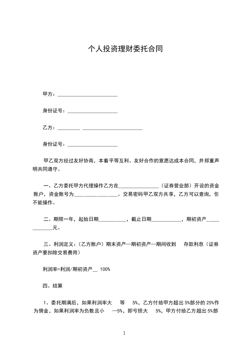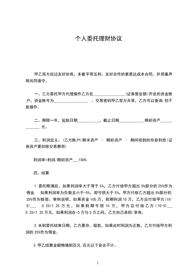 1.委托期满后,如果利润率大于等于5%,乙方付给甲方超出5%部分的25%作为佣金, 如果利润率为负数且小于-5%,即亏损大于5%,甲方付给乙方超出5%部分的25%作为赔偿。举例说明,如果资金100万,到期利润10万,乙方应付给甲方(10-5)___ 0.25=1.25万元,如果到期亏损10万,甲方应付给乙方(10-5)___ 0.25=1.25万元,如果利润在-5万与5万之间,乙方自己承担/享有。