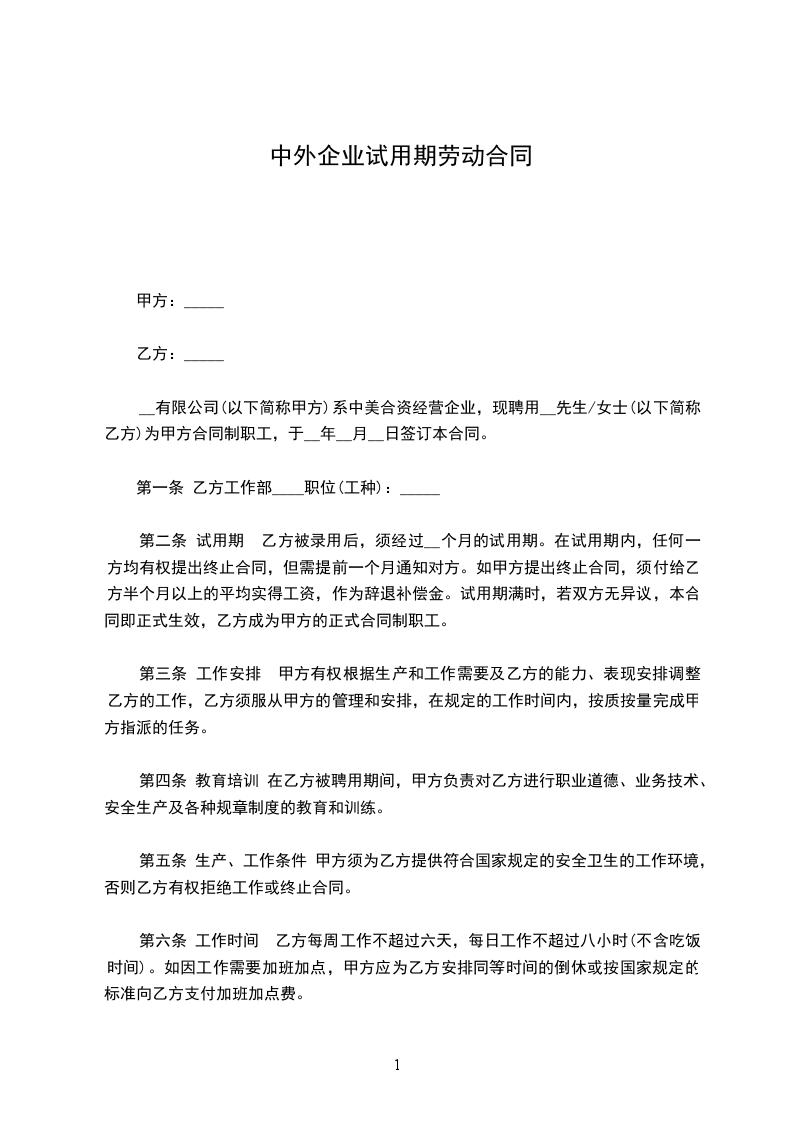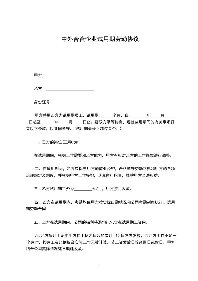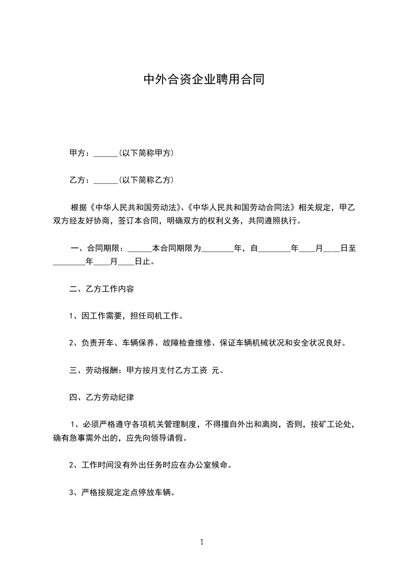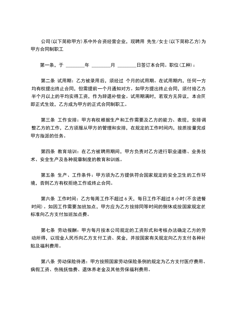 公司(以下简称甲方)系中外合资经营企业,现聘用 先生/女士(以下简称乙方)为甲方合同制职工