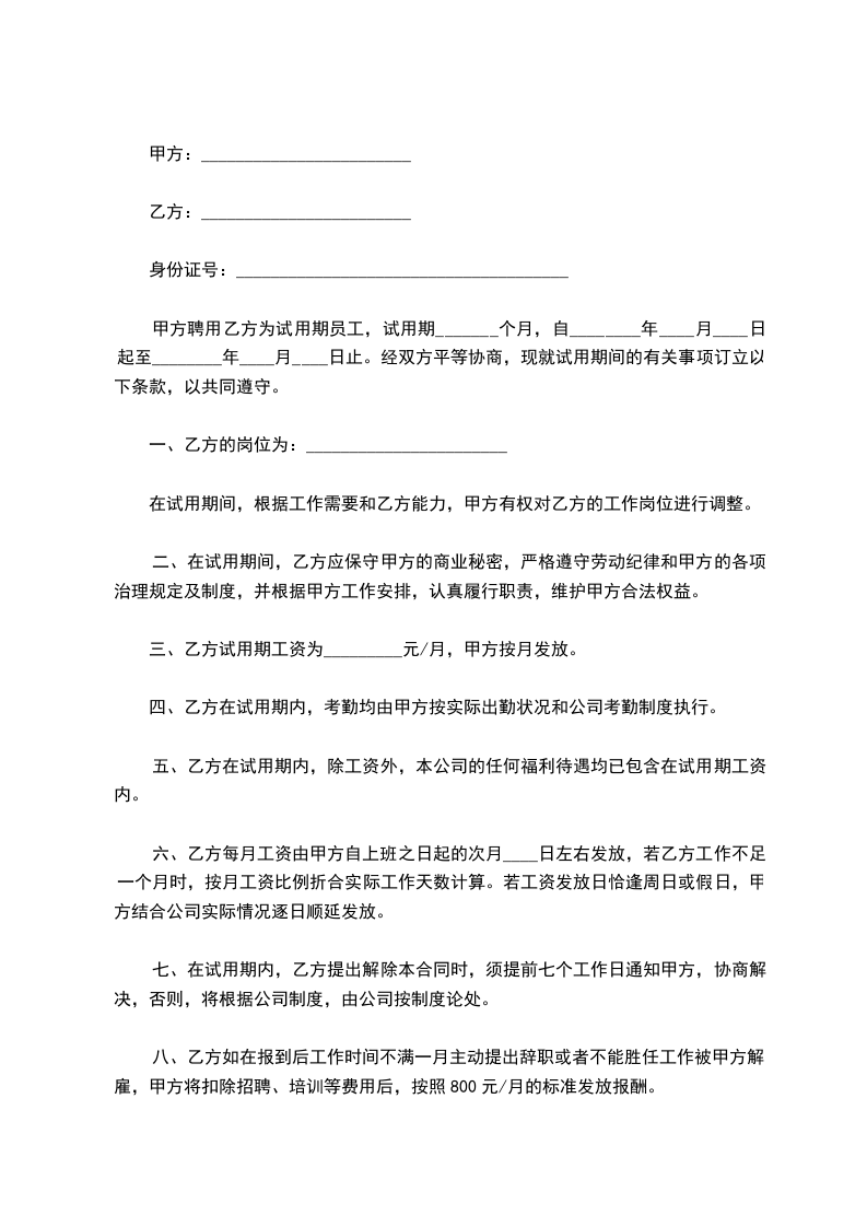 第二条 试用期:乙方被录用后,须经过 个月的试用期。在试用期内,任何一方均有权提出终止合同,但需提前一个月通知对方。如甲方提出终止合同,须付给乙方半个月以上的平均实得工资,作为辞退补偿金。试用期满时,若双方无异议,本合同即正式生效,乙方成为甲方的正式合同制职工。