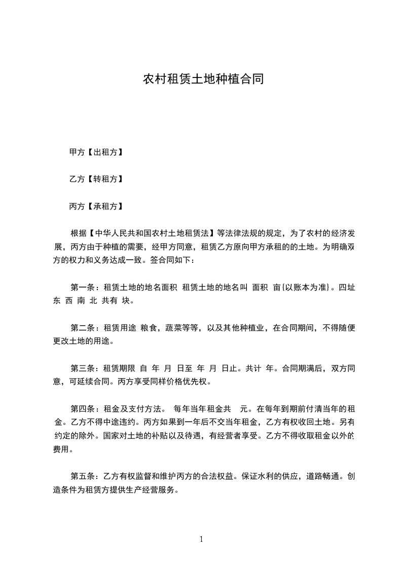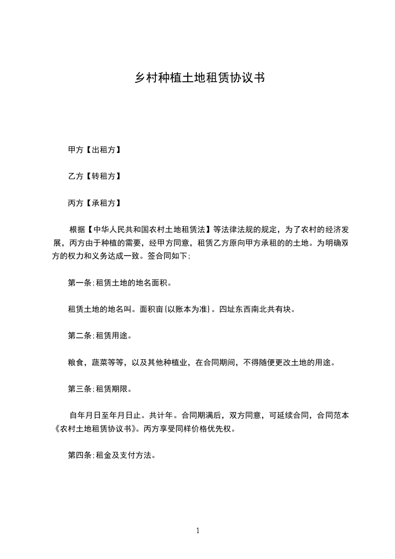 根据【中华人民共和国农村土地租赁法】等法律法规的规定,为了农村的经济发展,丙方由于种植的需要,经甲方同意,租赁乙方原向甲方承租的的土地。为明确双方的权力和义务达成一致。签合同如下;