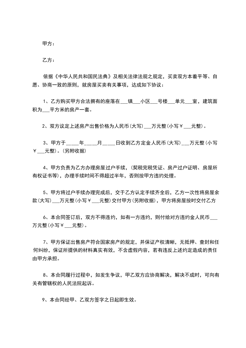 依据《中华人民共和国民法典》及相关法律法规之规定,买卖双方本着平等、自愿、协商一致的原则,就房屋买卖有关事项,达成如下协议: