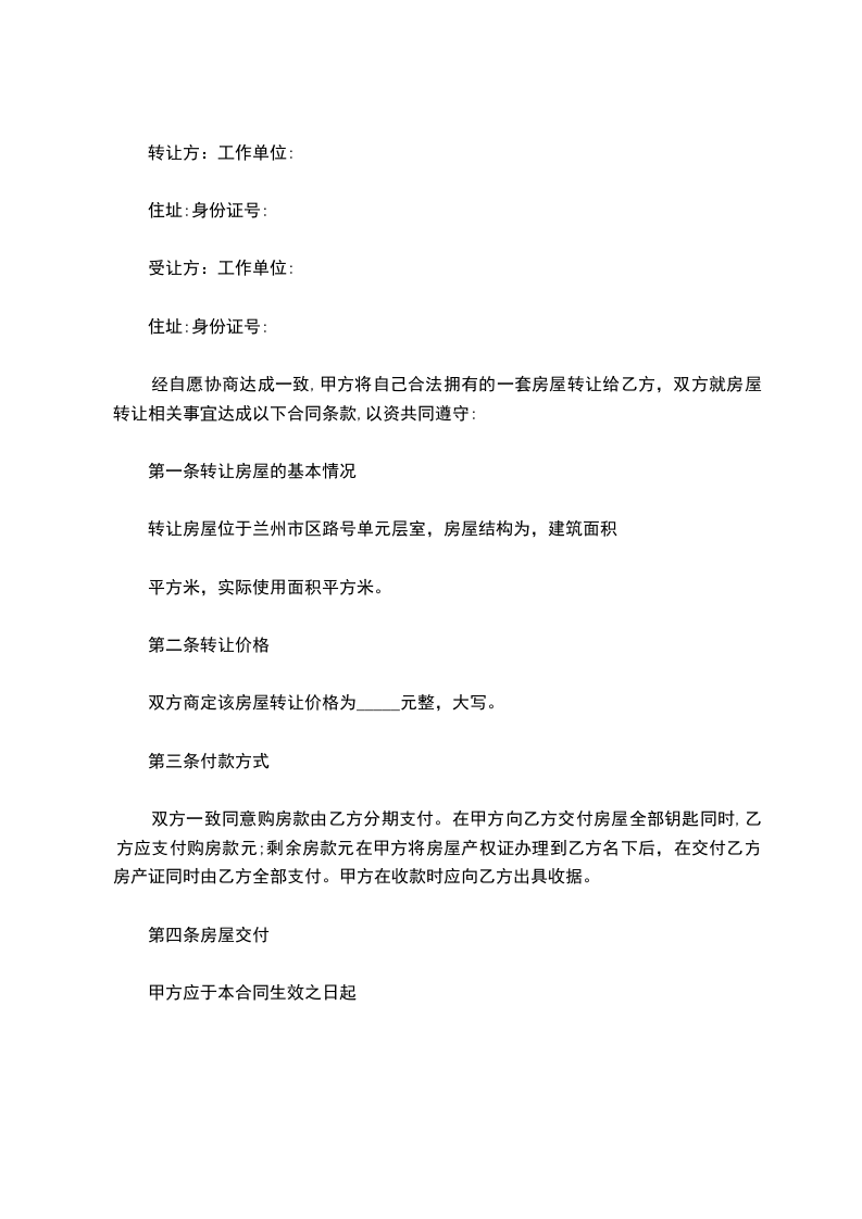 1、乙方购买甲方合法拥有的座落在___镇___小区___号楼___单元___室,建筑面积为___平方米的房产一套。