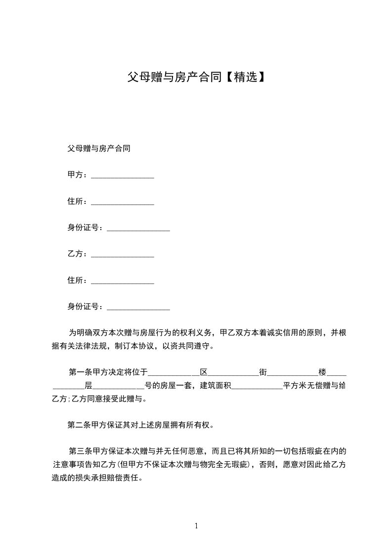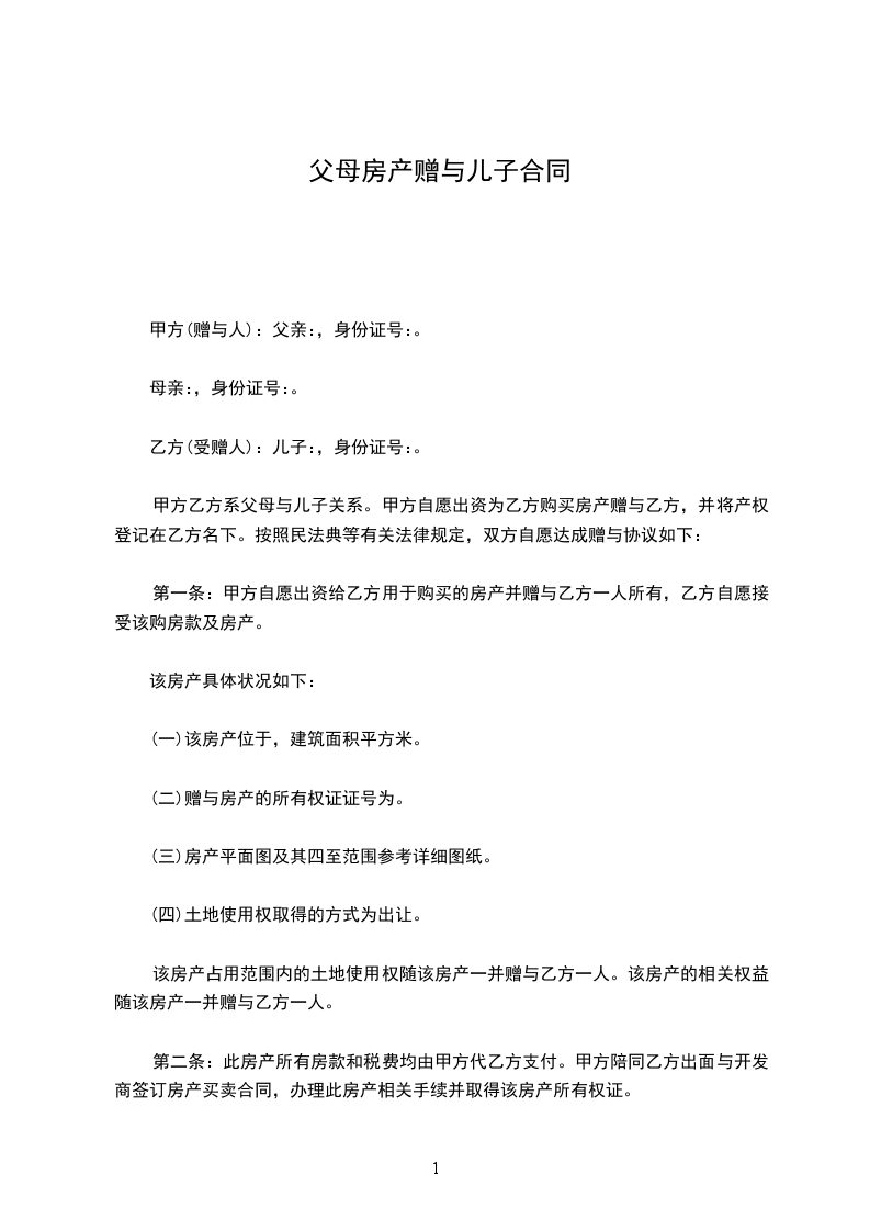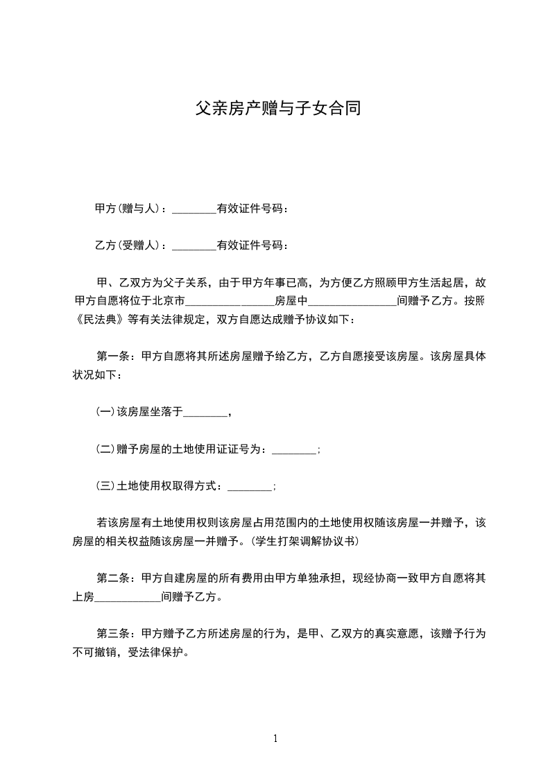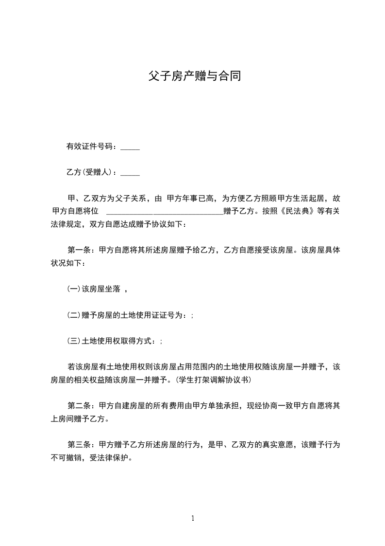 甲方系乙方的父亲,为使乙方更好和更方便地抚养甲方,以及避免乙方与兄弟姐妹间的房产纠纷,甲方(包括产权共有人____________,以下甲方均代表本人及产权共有人)自愿将所有的不动产房产赠与乙方,按照《民法典》等有关法律法规的规定,双方自愿达成赠与房产协议如下: