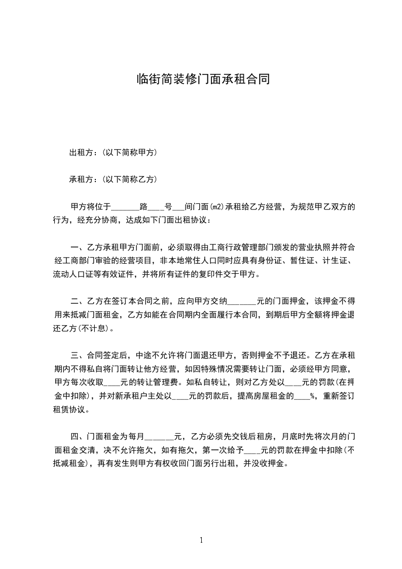 甲方将位于_______路____号___间门面(m2)承租给乙方经营,为规范甲乙双方的行为,经充分协商,达成如下门面出租协议: