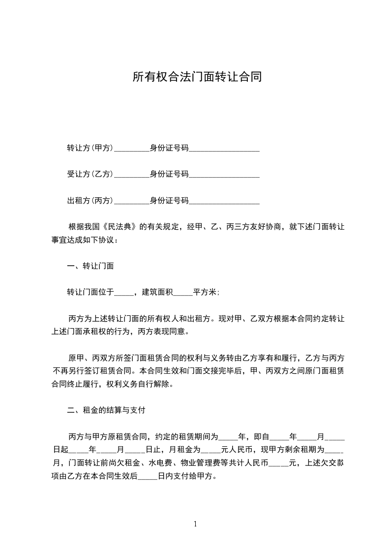 根据我国《民法典》的有关规定,经甲、乙、丙三方友好协商,就下述门面转让事宜达成如下协议: