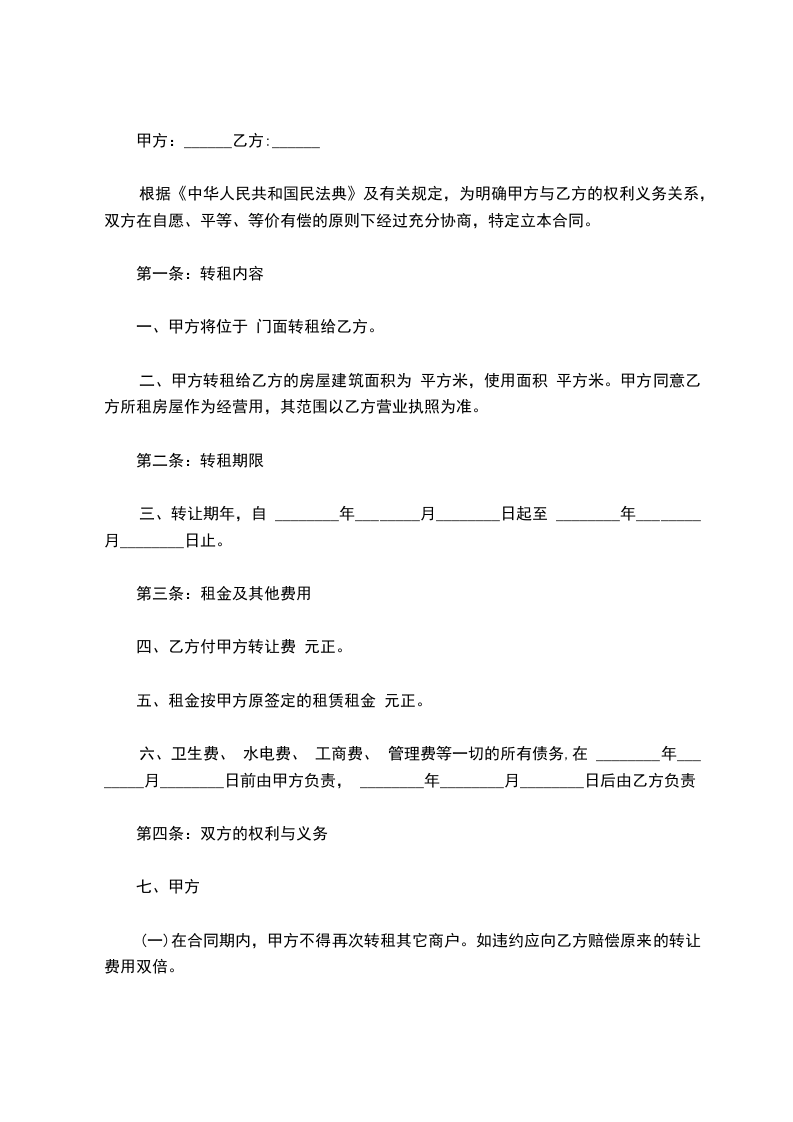 丙方与甲方原租赁合同,约定的租赁期间为_____年,即自_____年_____月_____日起_____年_____月_____日止,月租金为_____元人民币,现甲方剩余租期为_____月,门面转让前尚欠租金、水电费、物业管理费等共计人民币_____元,上述欠交款项由乙方在本合同生效后_____日内支付给甲方。