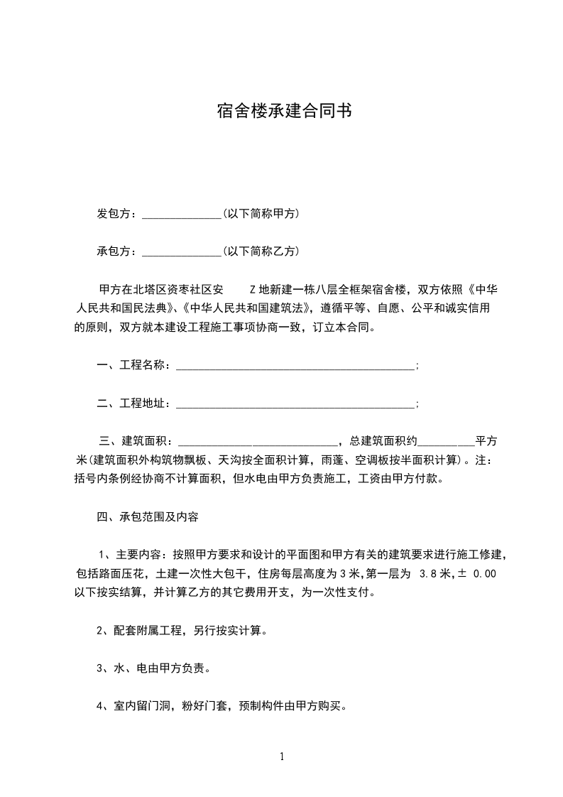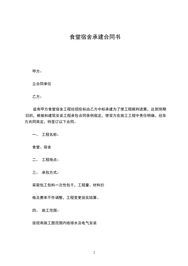 兹有甲方食堂宿舍工程经招投标由乙方中标承建为了使工程顺利进展,达到预期目的,根据和建筑安装工程承包合同条例规定,使双方在施工工程中责任明确,经双方共同商定,特签订以下合同。