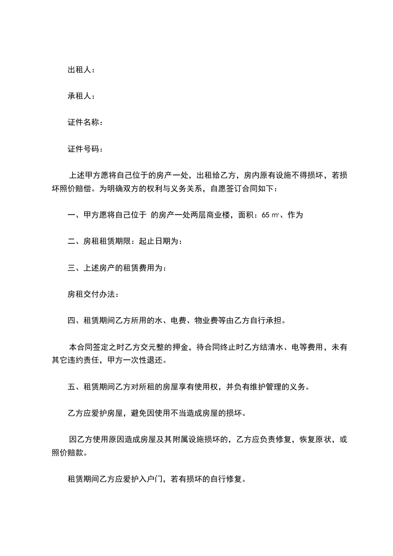 一、甲方愿将自己位于 的房产一处两层商业楼,面积:65㎡、作为