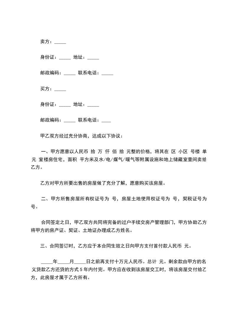 _____年_____月_____日之前再支付十万元人民币。总计 元。剩余款由甲方的名义贷款乙方还贷的方式5年内付完。甲方应在收到该房屋交工时,将该房屋交付给乙方,此房屋才属于乙方所有。