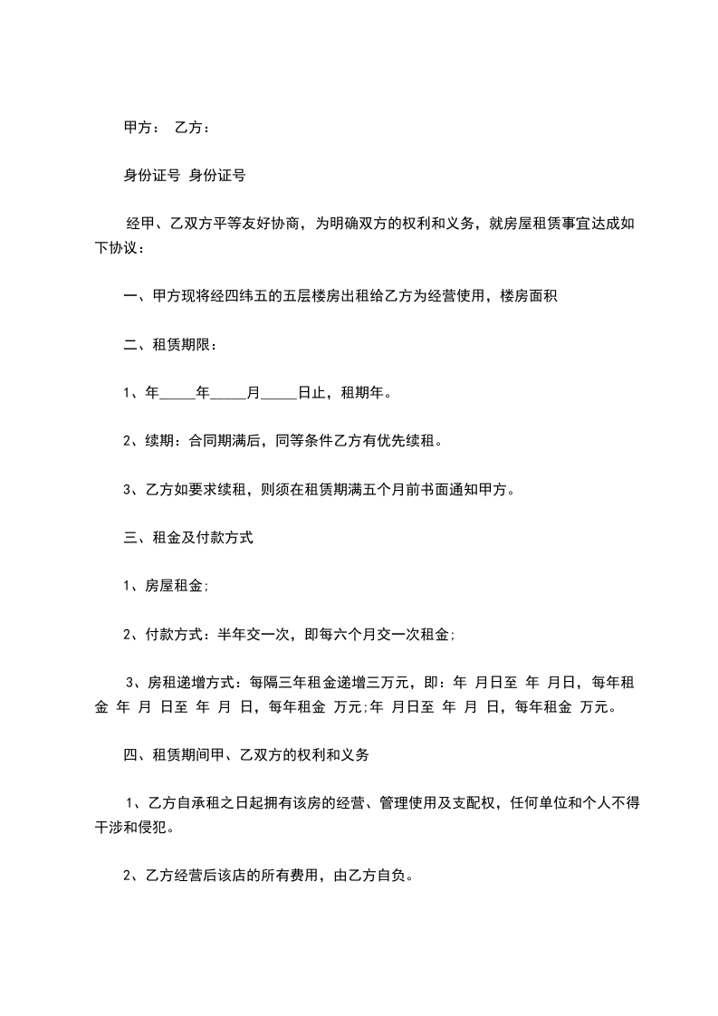 一、甲方现将经四纬五的五层楼房出租给乙方为经营使用,楼房面积