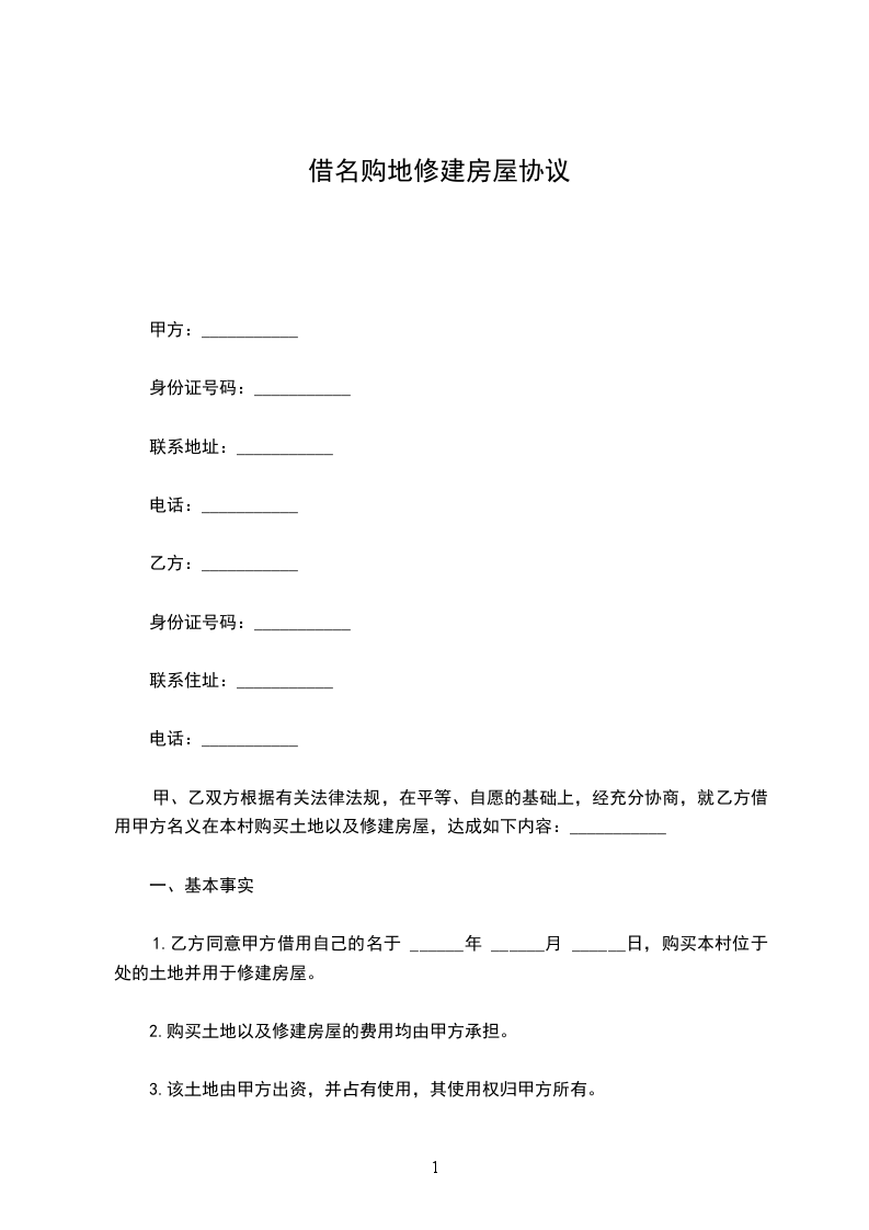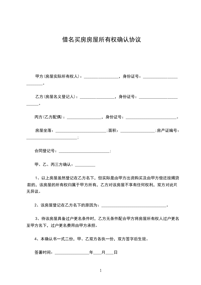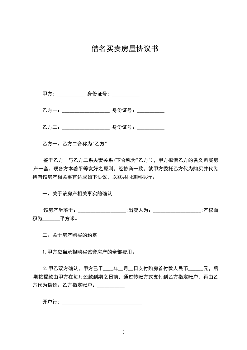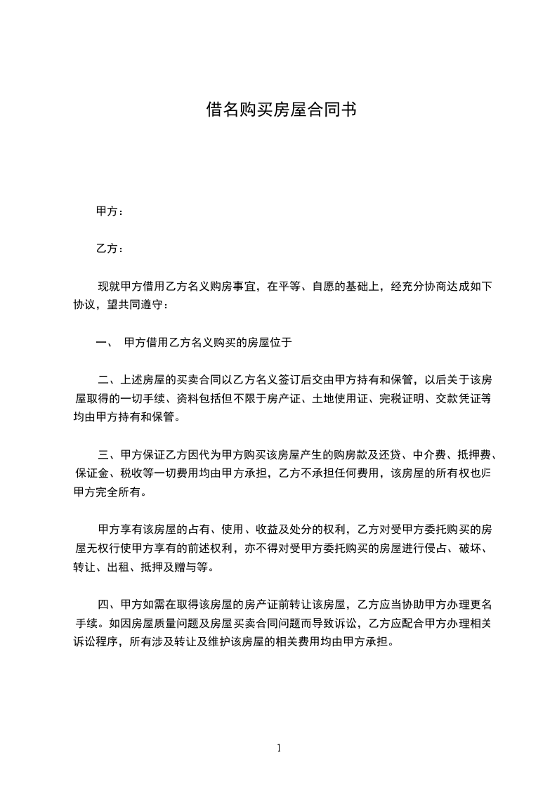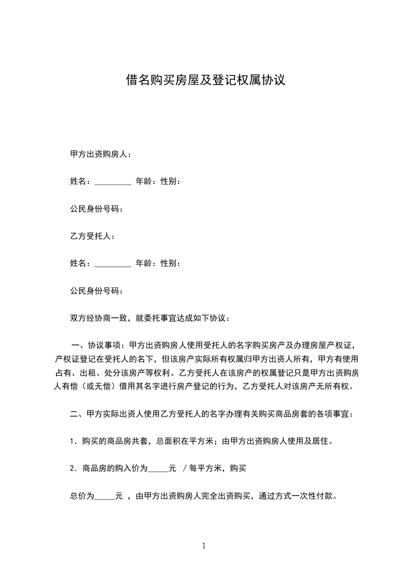 现就甲方借用乙方名义购房事宜,在平等、自愿的基础上,经充分协商达成如下协议,望共同遵守: