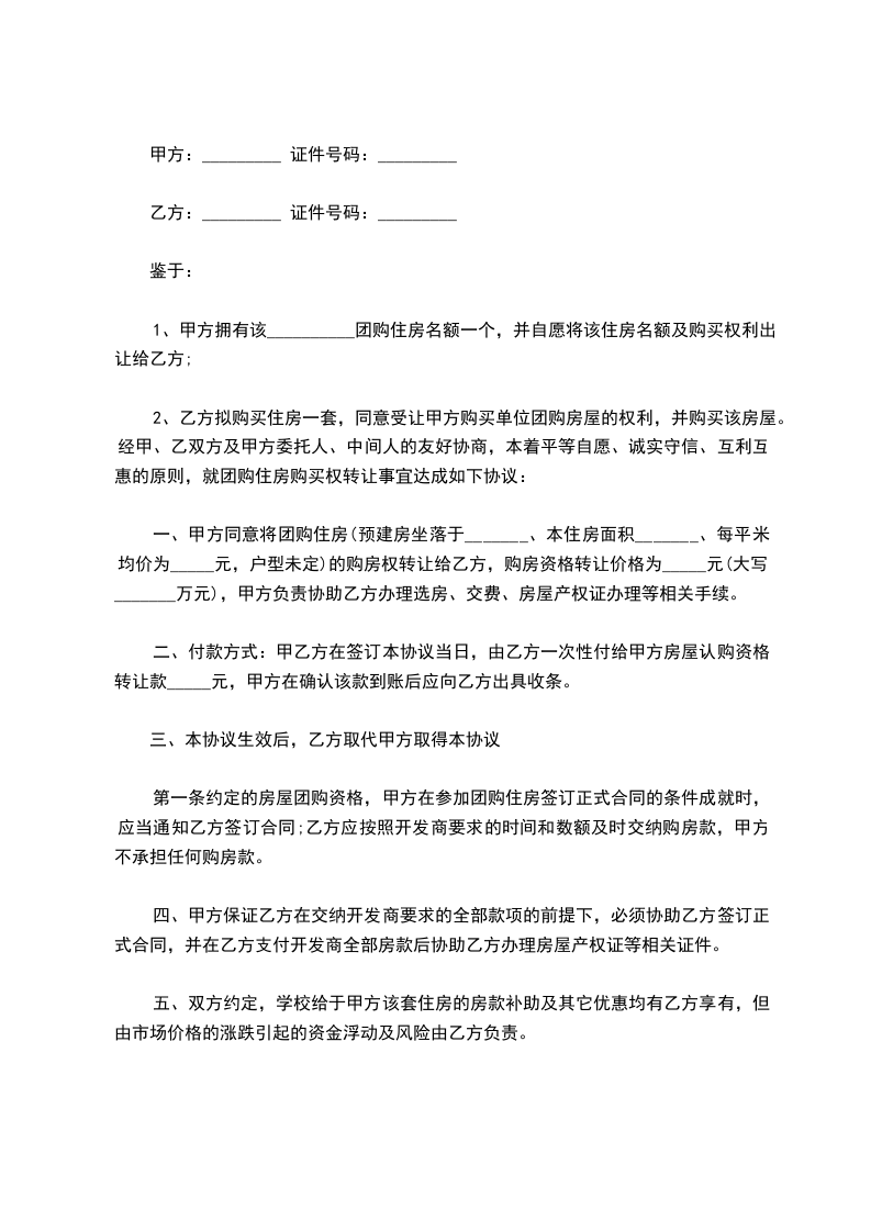 四、甲方如需在取得该房屋的房产证前转让该房屋,乙方应当协助甲方办理更名手续。如因房屋质量问题及房屋买卖合同问题而导致诉讼,乙方应配合甲方办理相关诉讼程序,所有涉及转让及维护该房屋的相关费用均由甲方承担。