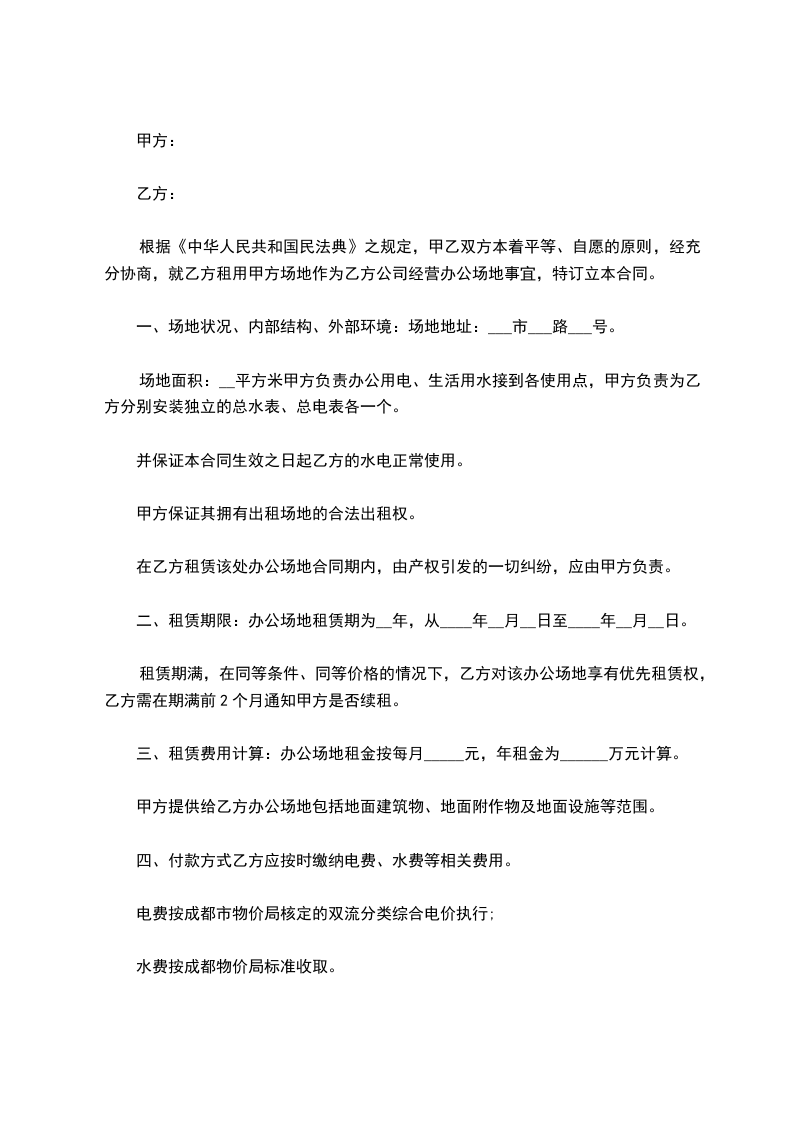 根据《中华人民共和国民法典》之规定,甲乙双方本着平等、自愿的原则,经充分协商,就乙方租用甲方场地作为乙方公司经营办公场地事宜,特订立本合同。