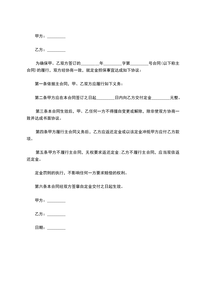 为确保甲、乙双方签订的_____年_____字第_____号合同的履行,双方经协商一致,就定金担保事宜达成如下协议: