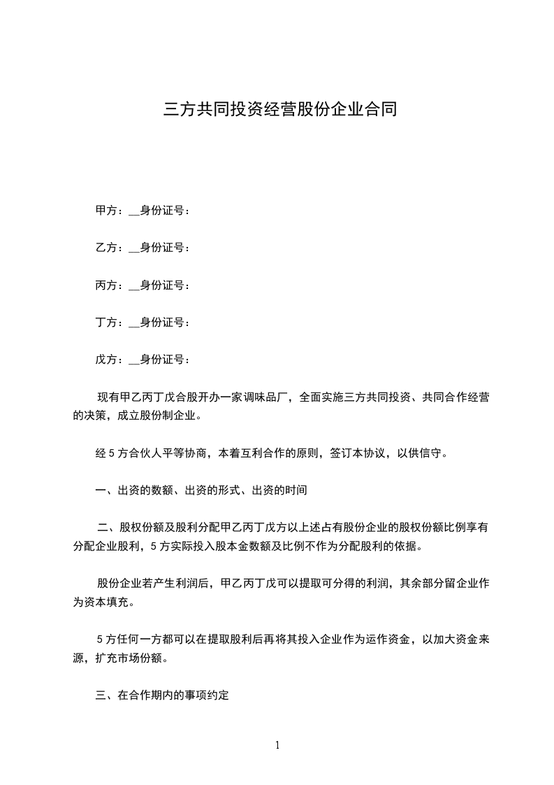 现有甲乙丙丁戊合股开办一家调味品厂,全面实施三方共同投资、共同合作经营的决策,成立股份制企业。