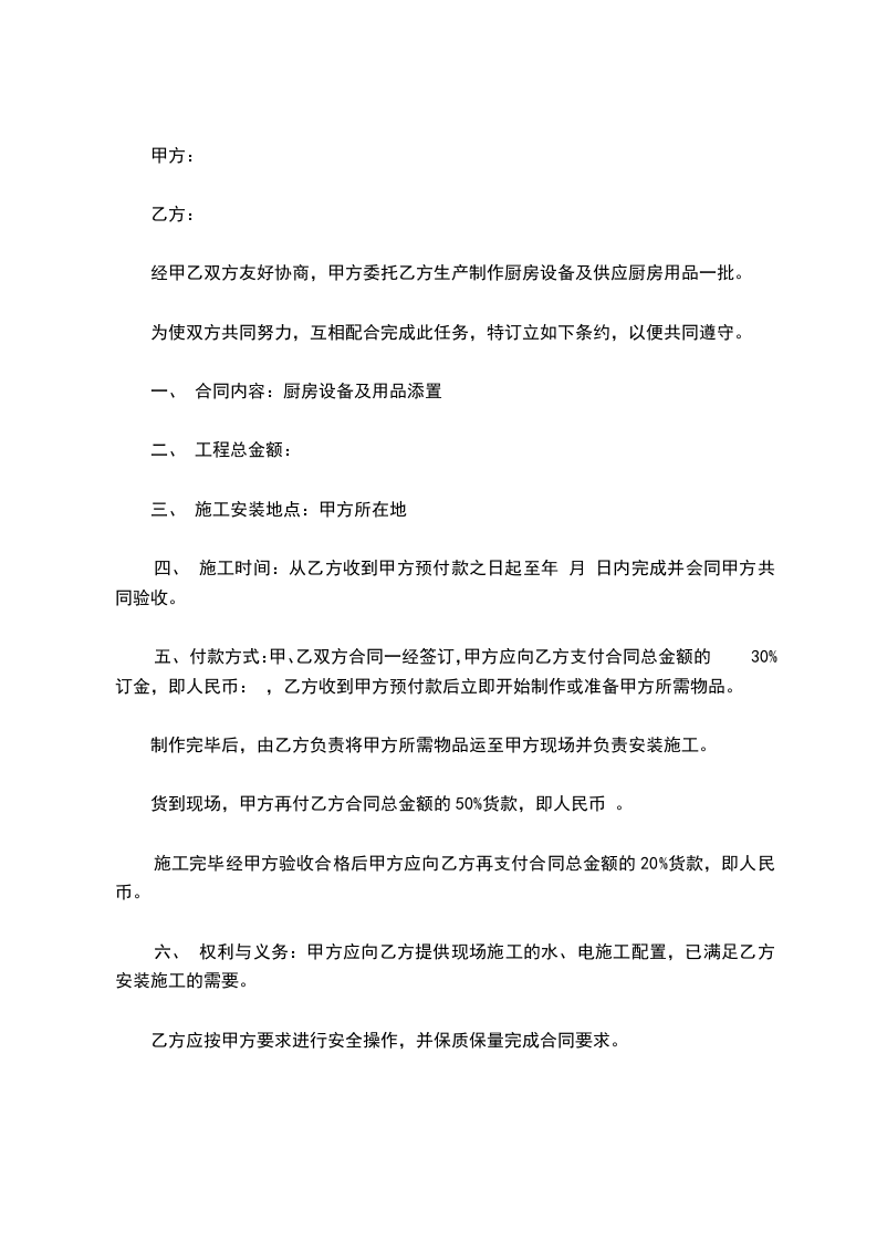 经甲乙双方友好协商,甲方委托乙方生产制作厨房设备及供应厨房用品一批。