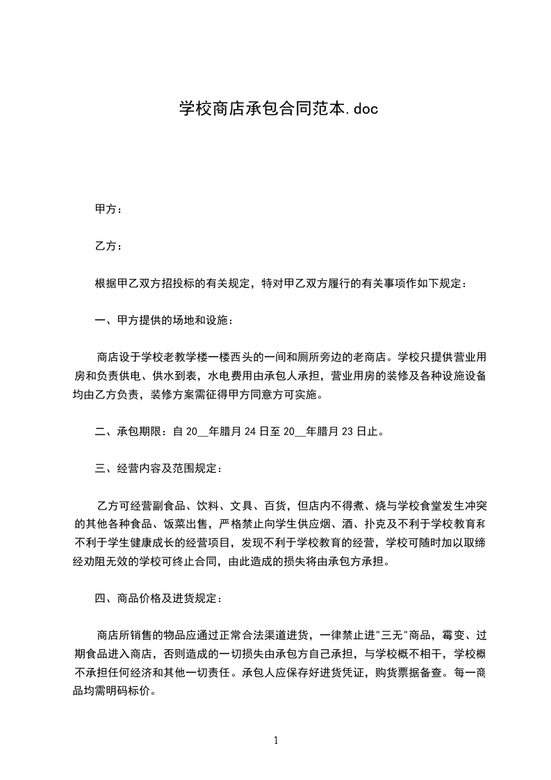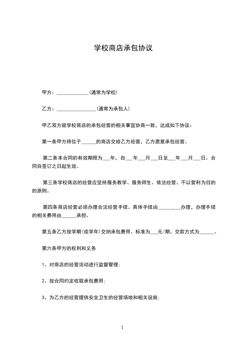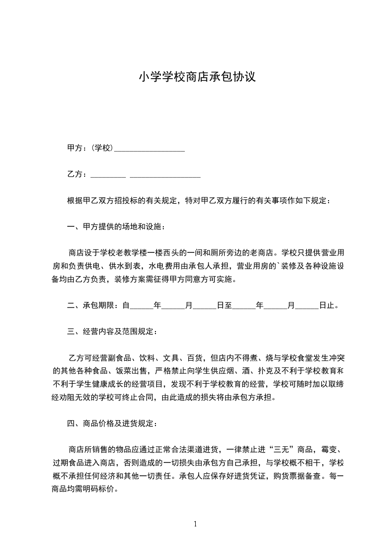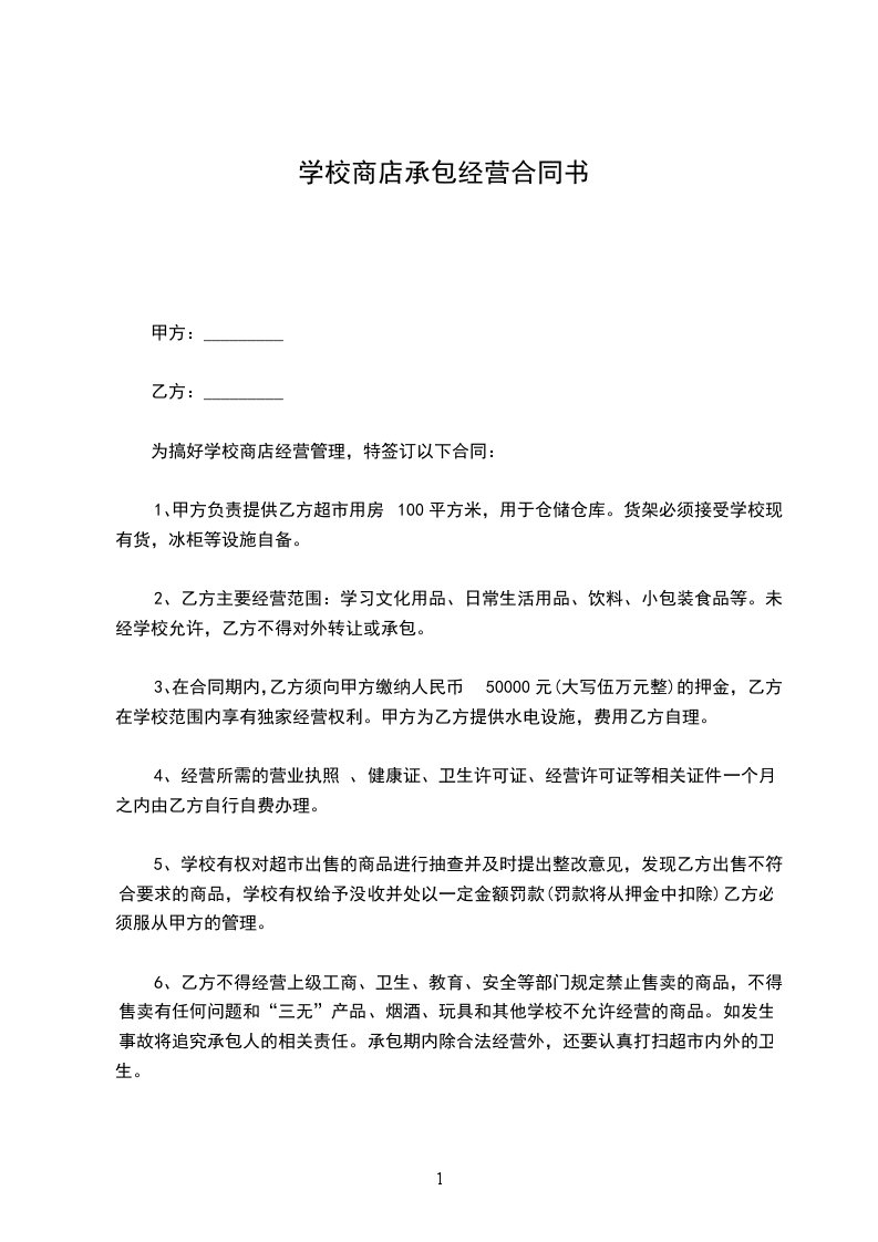 6、乙方不得经营上级工商、卫生、教育、安全等部门规定禁止售卖的商品,不得售卖有任何问题和“三无”产品、烟酒、玩具和其他学校不允许经营的商品。如发生事故将追究承包人的相关责任。承包期内除合法经营外,还要认真打扫超市内外的卫生。
