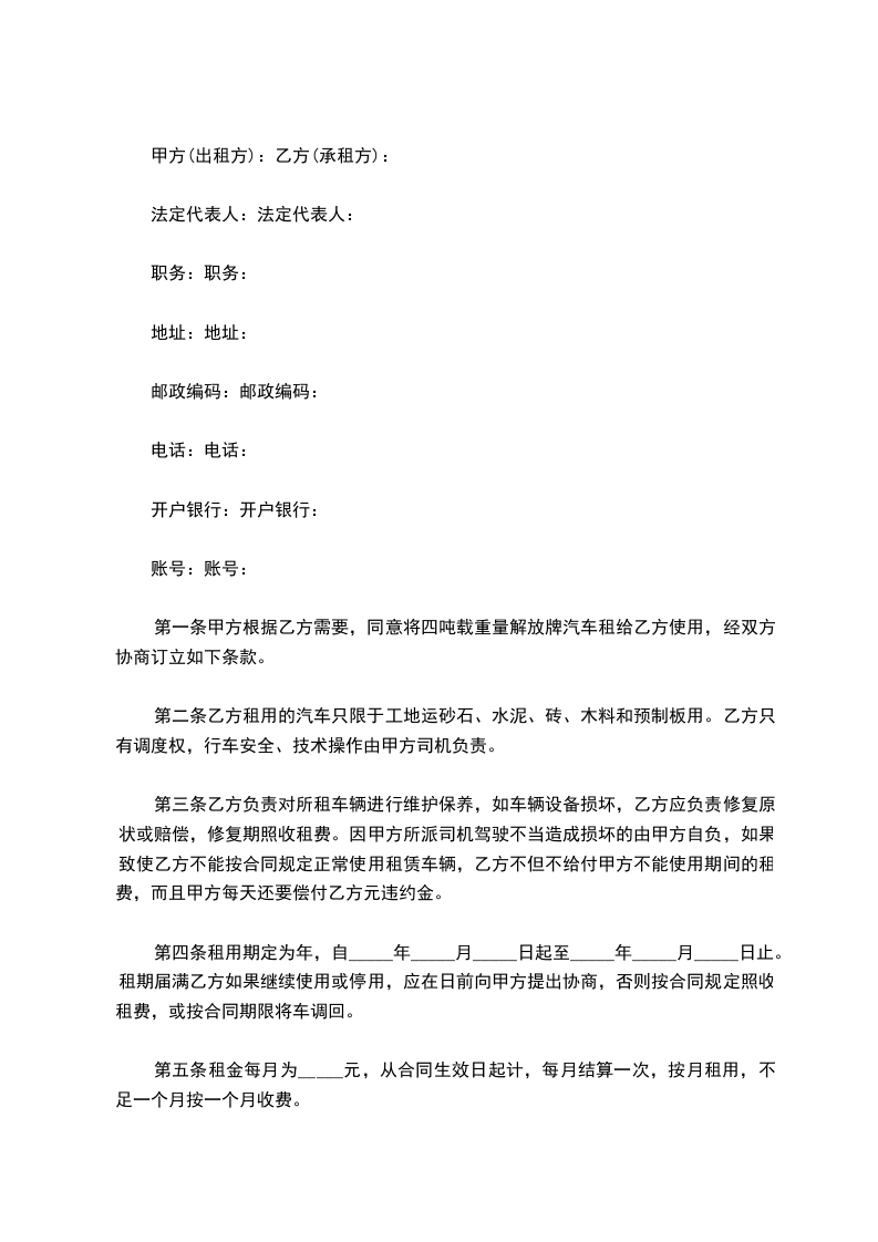 第一条甲方根据乙方需要,同意将四吨载重量解放牌汽车租给乙方使用,经双方协商订立如下条款。