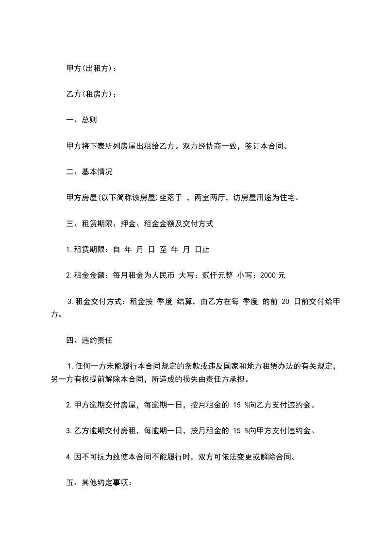 2.甲方逾期交付房屋,每逾期一日,按月租金的 15 %向乙方支付违约金。