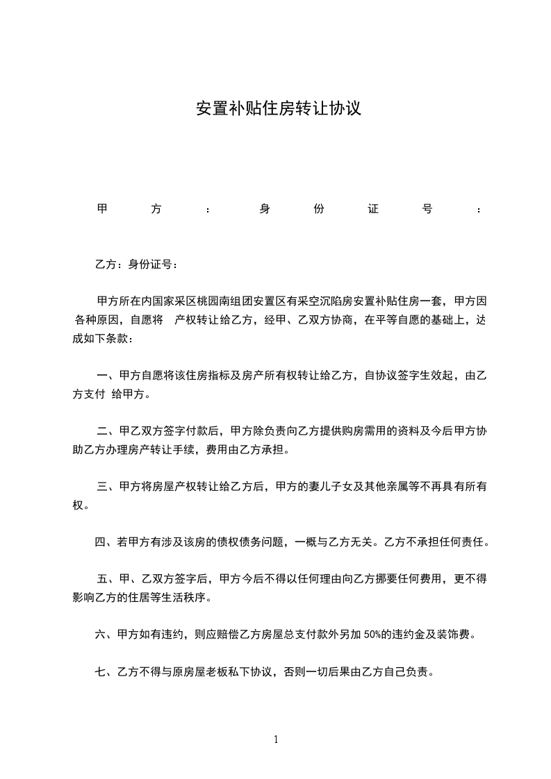 甲方所在内国家采区桃园南组团安置区有采空沉陷房安置补贴住房一套,甲方因各种原因,自愿将 产权转让给乙方,经甲、乙双方协商,在平等自愿的基础上,达成如下条款: