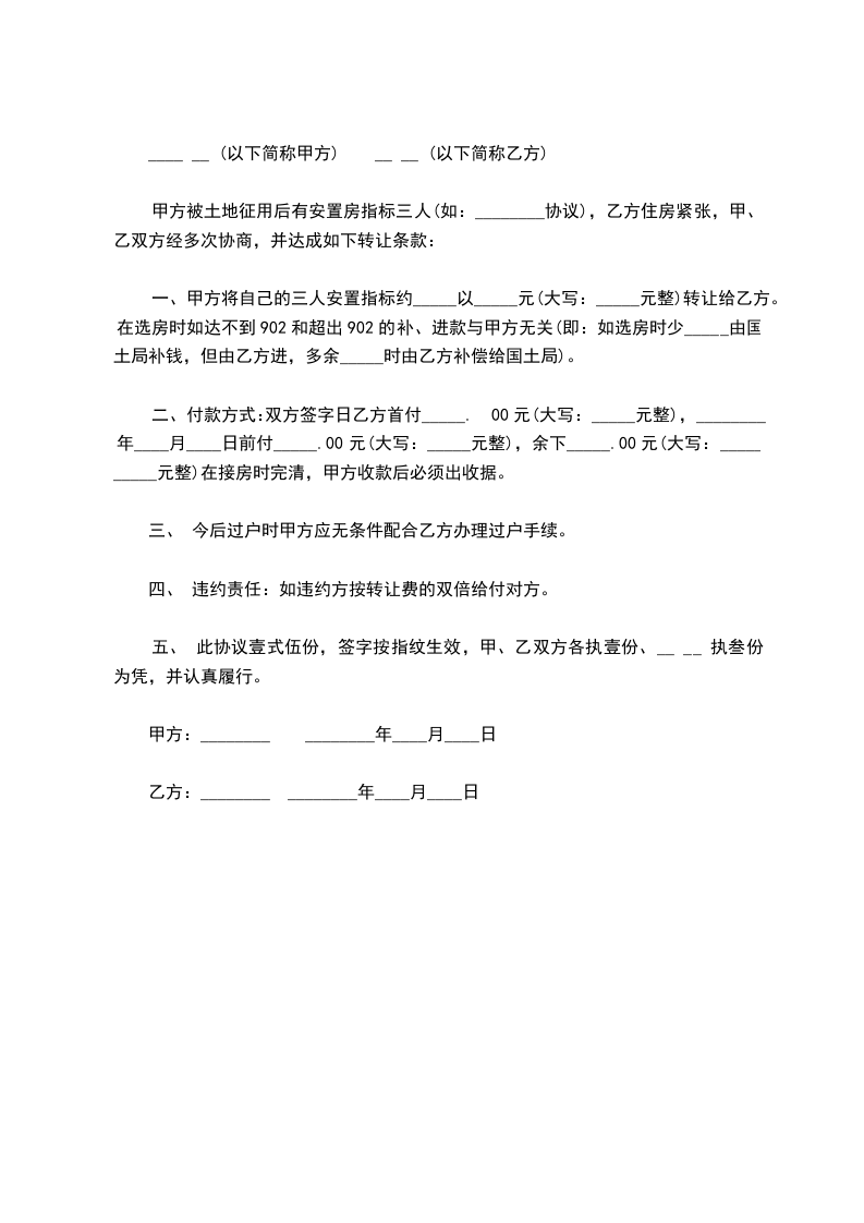 一、甲方自愿将该住房指标及房产所有权转让给乙方,自协议签字生效起,由乙方支付 给甲方。