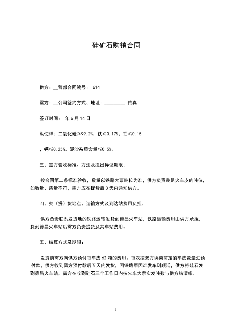 六、合同损耗及计算方式:需方磅房过磅数量和减少份(晴三雨四)为准。