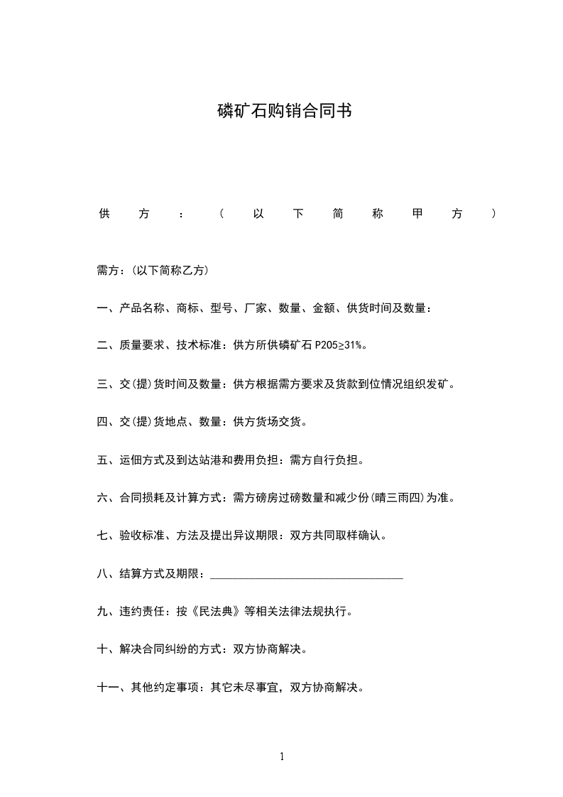 二、质量要求、技术标准:供方所供磷矿石P2O5≥31%。