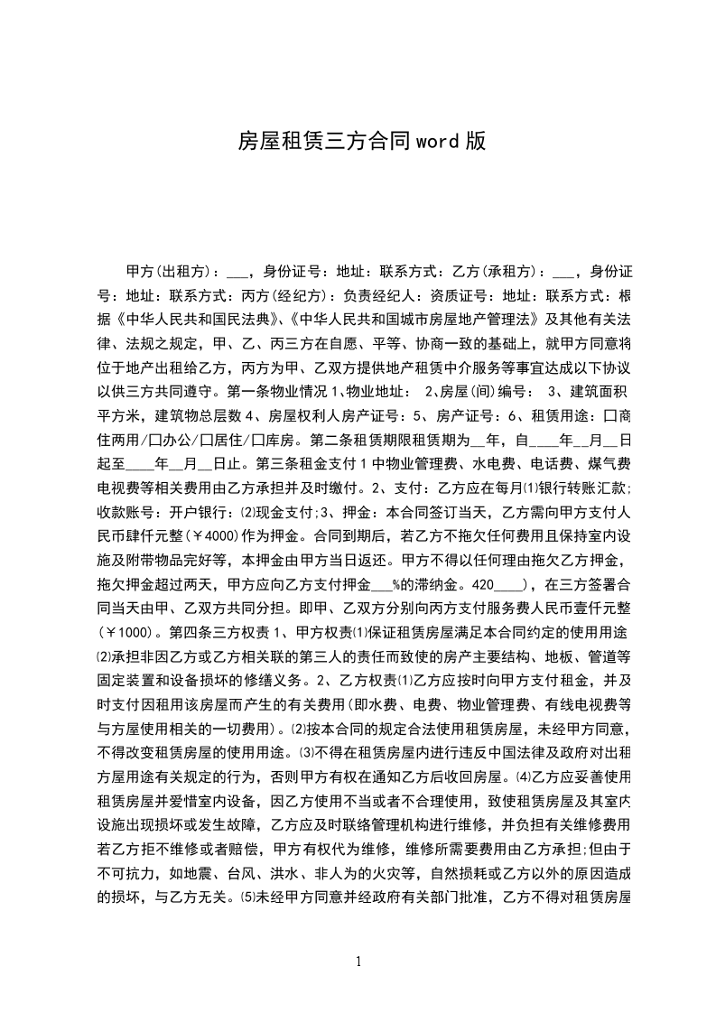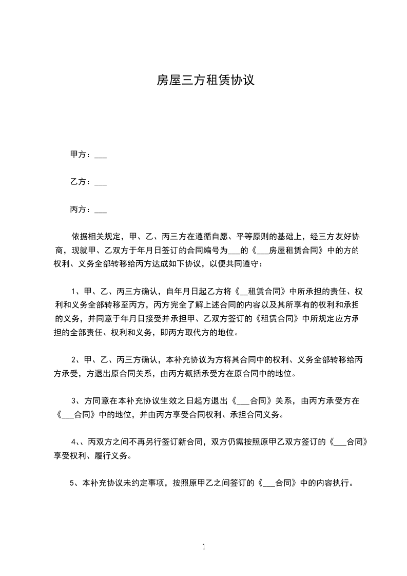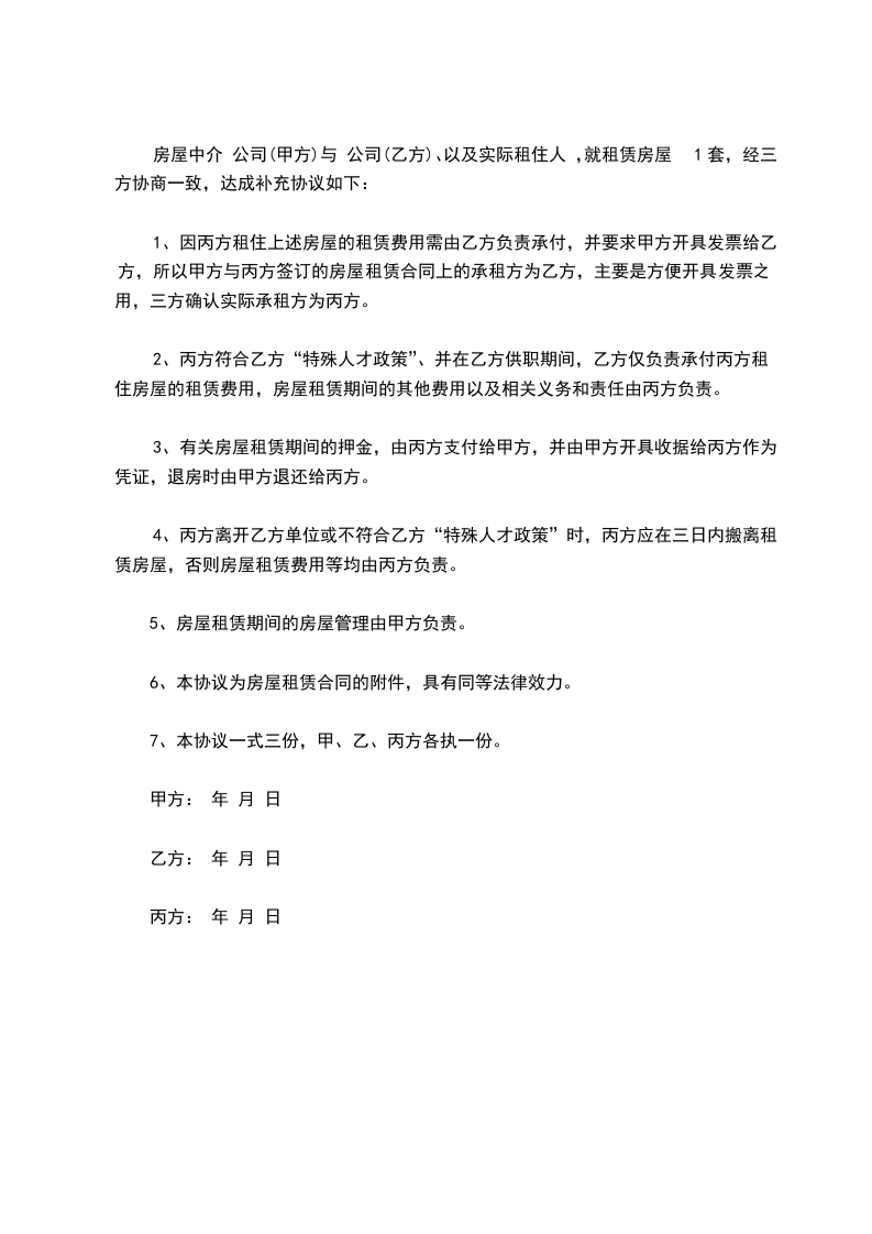 房屋中介 公司(甲方)与 公司(乙方)、以及实际租住人 ,就租赁房屋1套,经三方协商一致,达成补充协议如下: