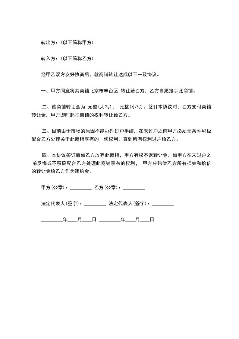 一、甲方同意将其商铺北京市丰台区 转让给乙方,乙方自愿接手此商铺。