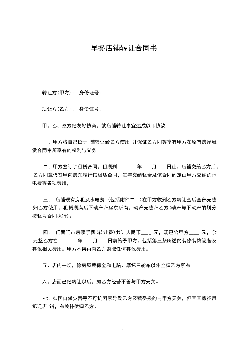 一、甲方同意将自己位于_______市________区_______街________________店铺转让给乙方使用,建筑面积_____平方米;并保证乙方同等享有甲方在原有房屋租赁合同中所享有的.权利与义务。
