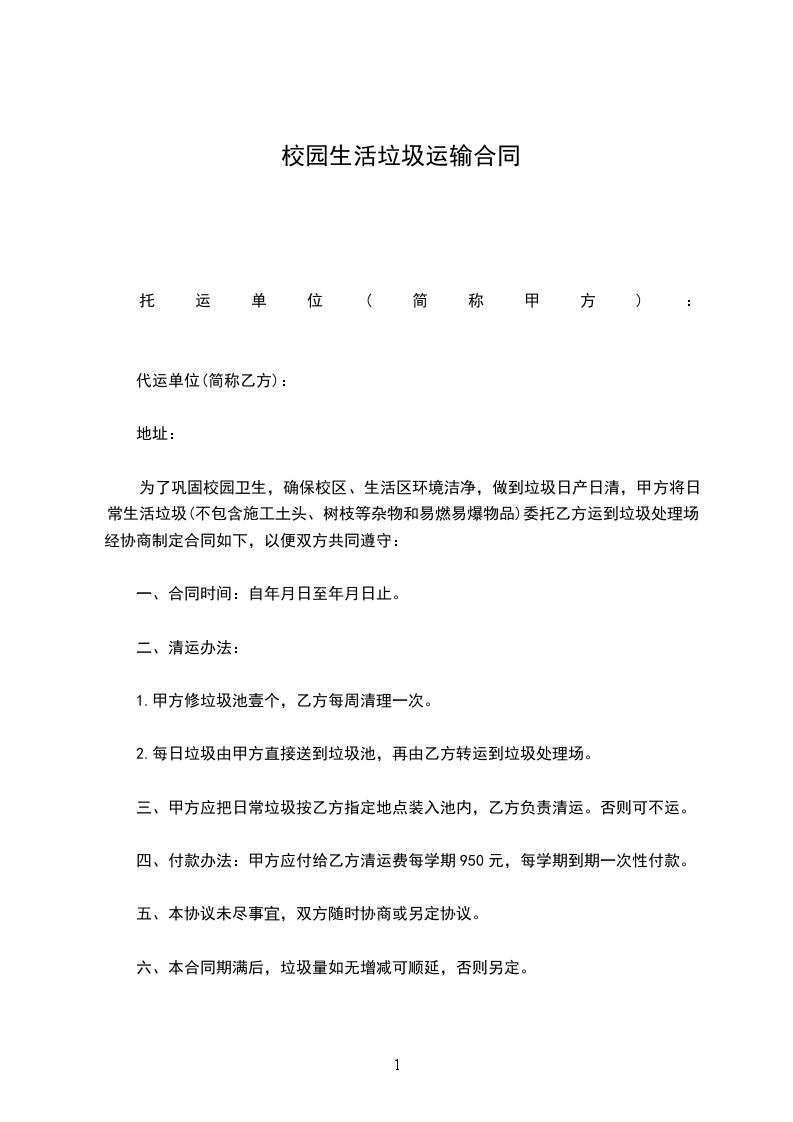 为了巩固校园卫生,确保校区、生活区环境洁净,做到垃圾日产日清,甲方将日常生活垃圾(不包含施工土头、树枝等杂物和易燃易爆物品)委托乙方运到垃圾处理场,经协商制定合同如下,以便双方共同遵守: