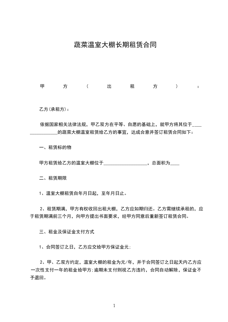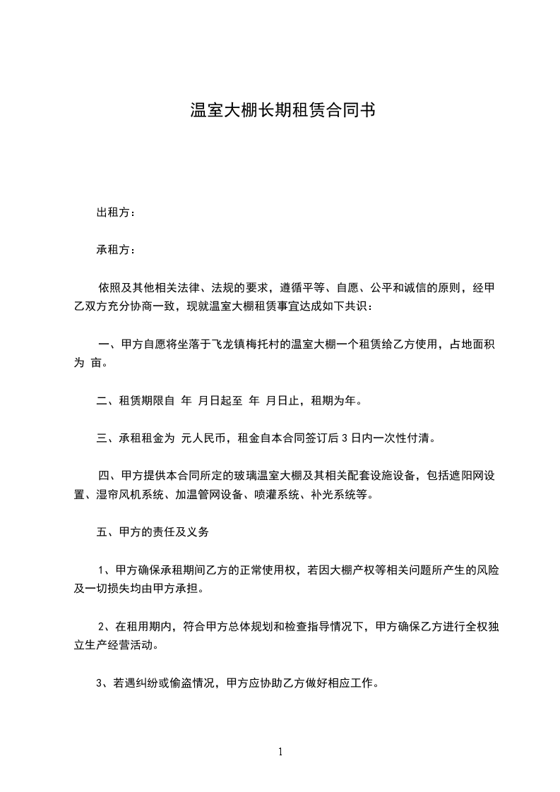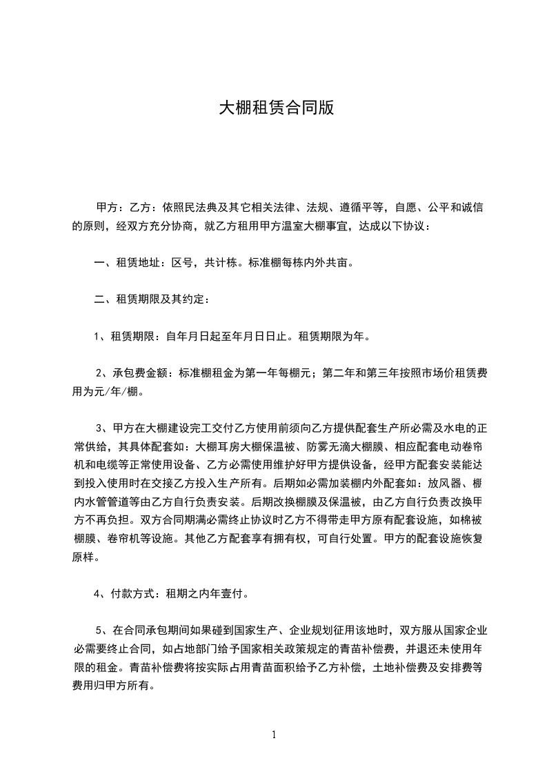 一 .甲方位于白家树林三十亩.大棚二座平房三间.租赁给乙方使用,租赁期为三年,租赁期间为年月起至_____年_____月_____日止,租赁费用为 元, 甲方提供打井用水,租赁期内甲方不得进行树木砍伐,如有不可抗因素(修路.征地等)除外。