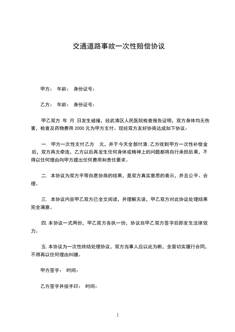 一. 甲方一次性支付乙方 元,并于今天全部付清;乙方收到甲方一次性补偿金后,双方再无牵连,乙方以后再发生任何身体或精神上的问题都将自行承担后果,不得以任何理由向甲方提出任何费用和责任要求。