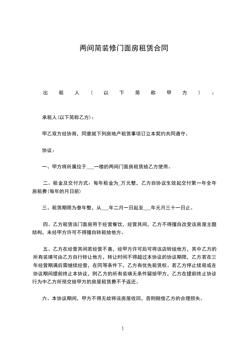 一、甲方将所属位于___一楼的两间门面房租赁给乙方使用。