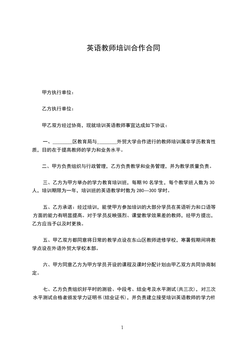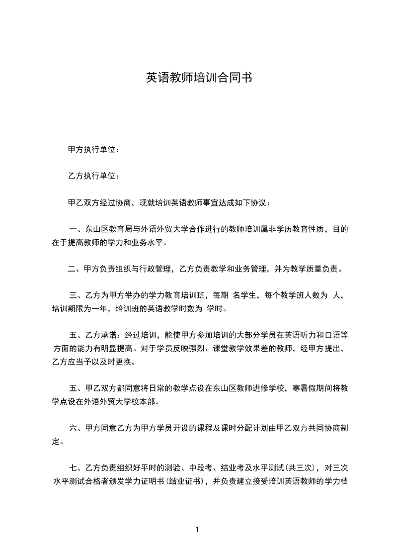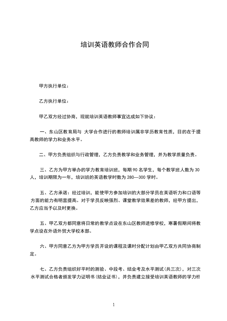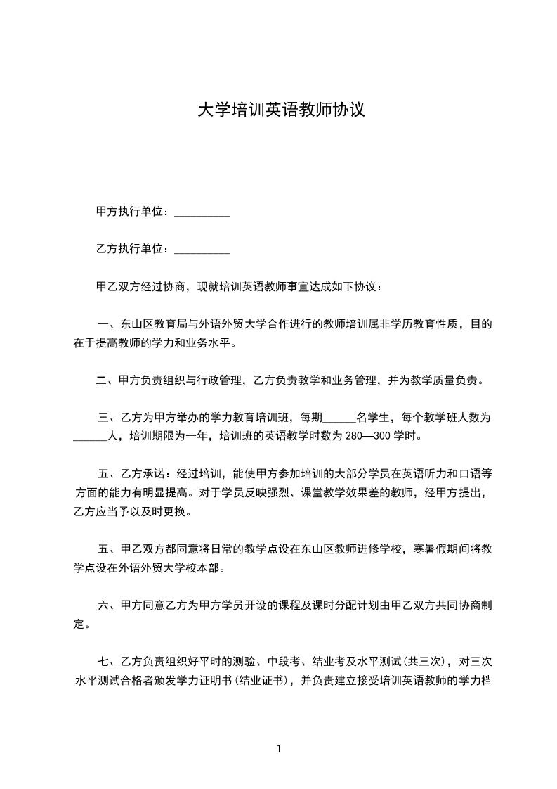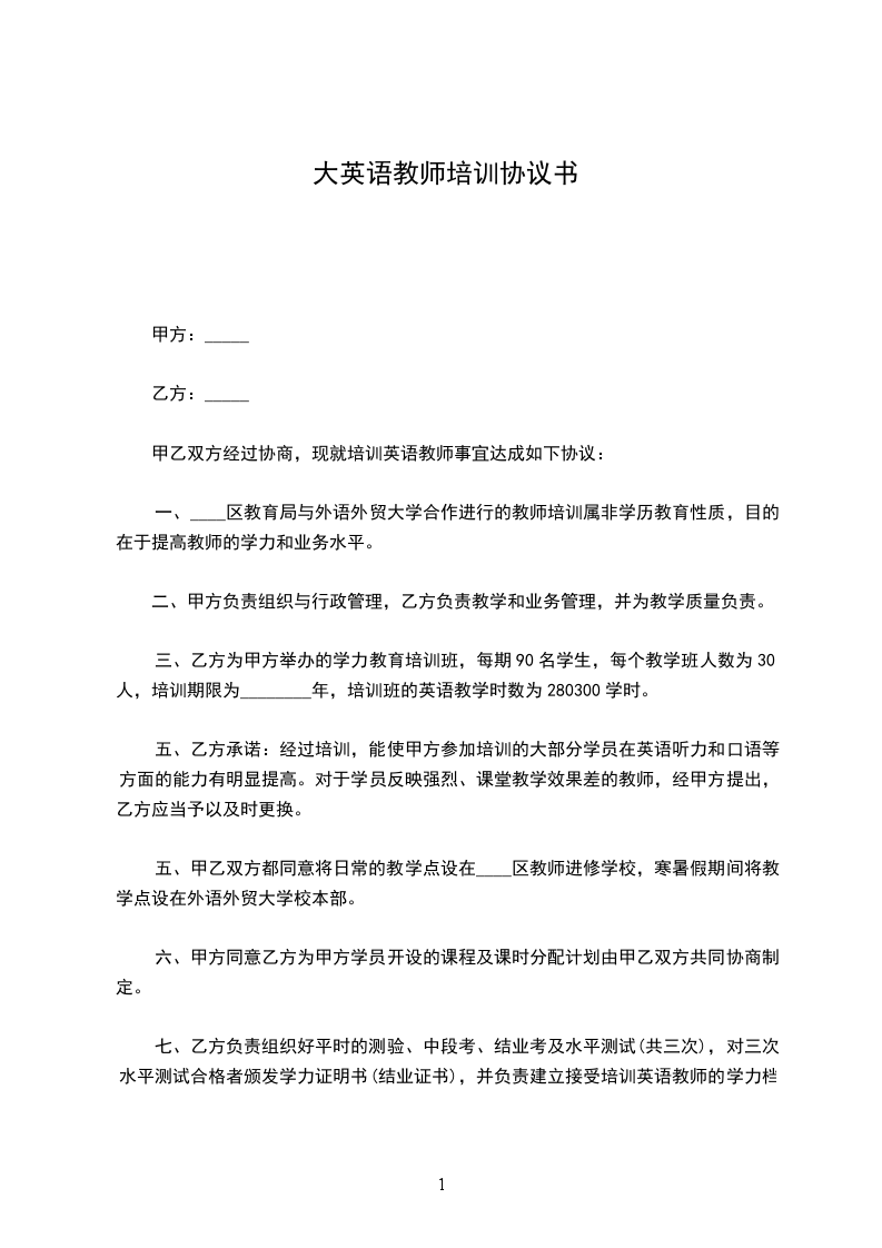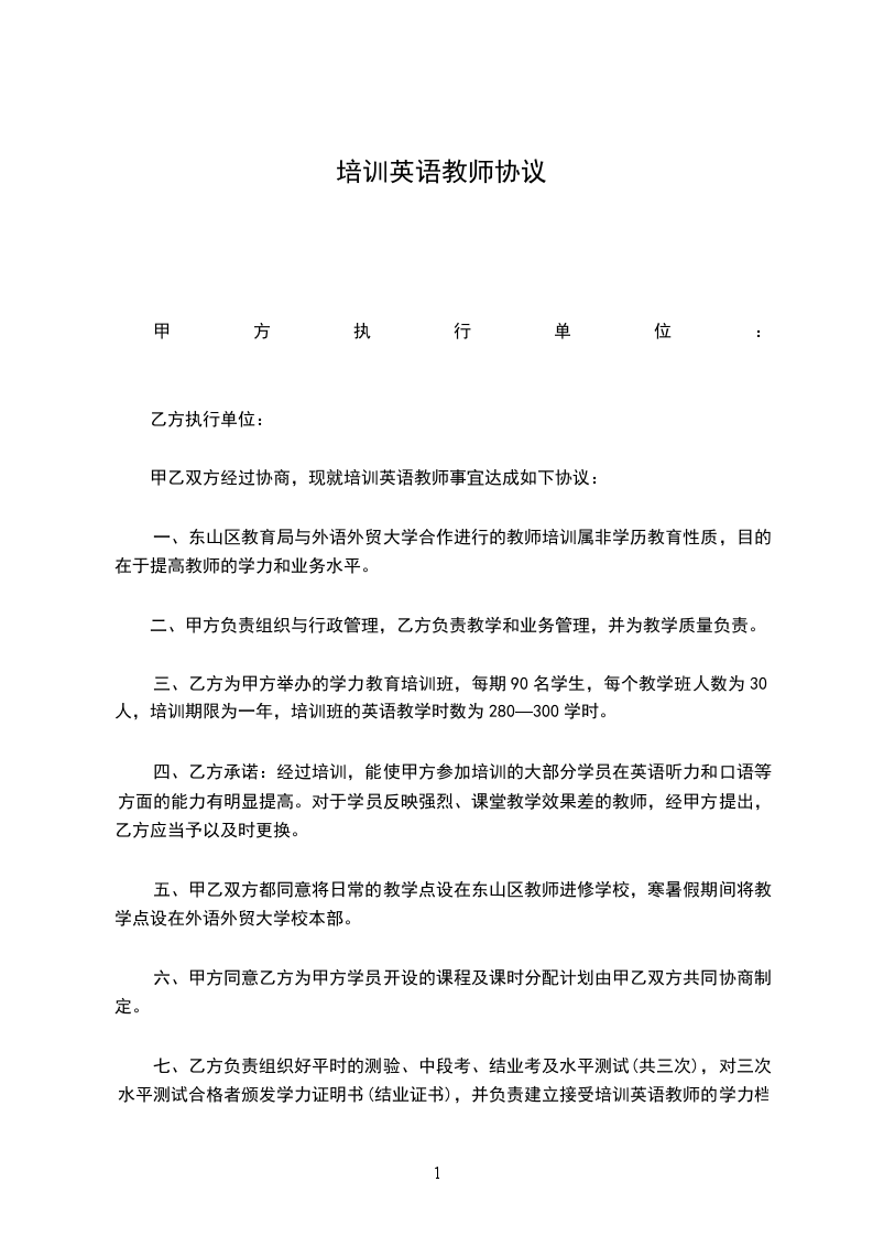 甲乙双方经过协商,现就培训英语教师事宜达成如下协议: