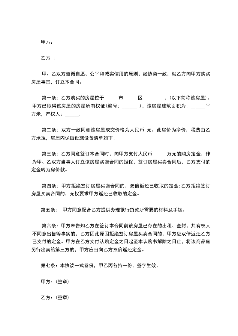 第二条:双方一致同意该房屋成交价格为人民币 元。此房价为净价,税费由乙方承担,房屋内保留设施设备清单如下: