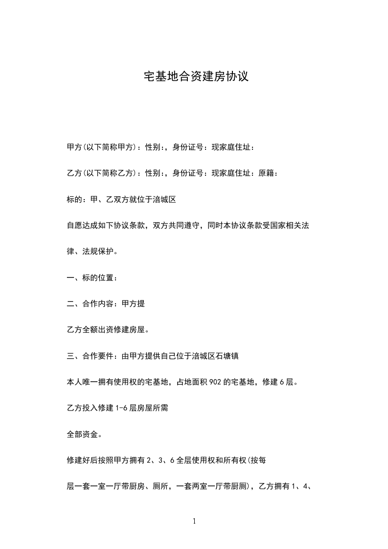 甲乙双方本着互利互惠的原则,经双方友好协商,决定共同合资在,即原甲方的宅基地上新建六层楼房,为明确双方权利义务,特订立此合资建房协议。
