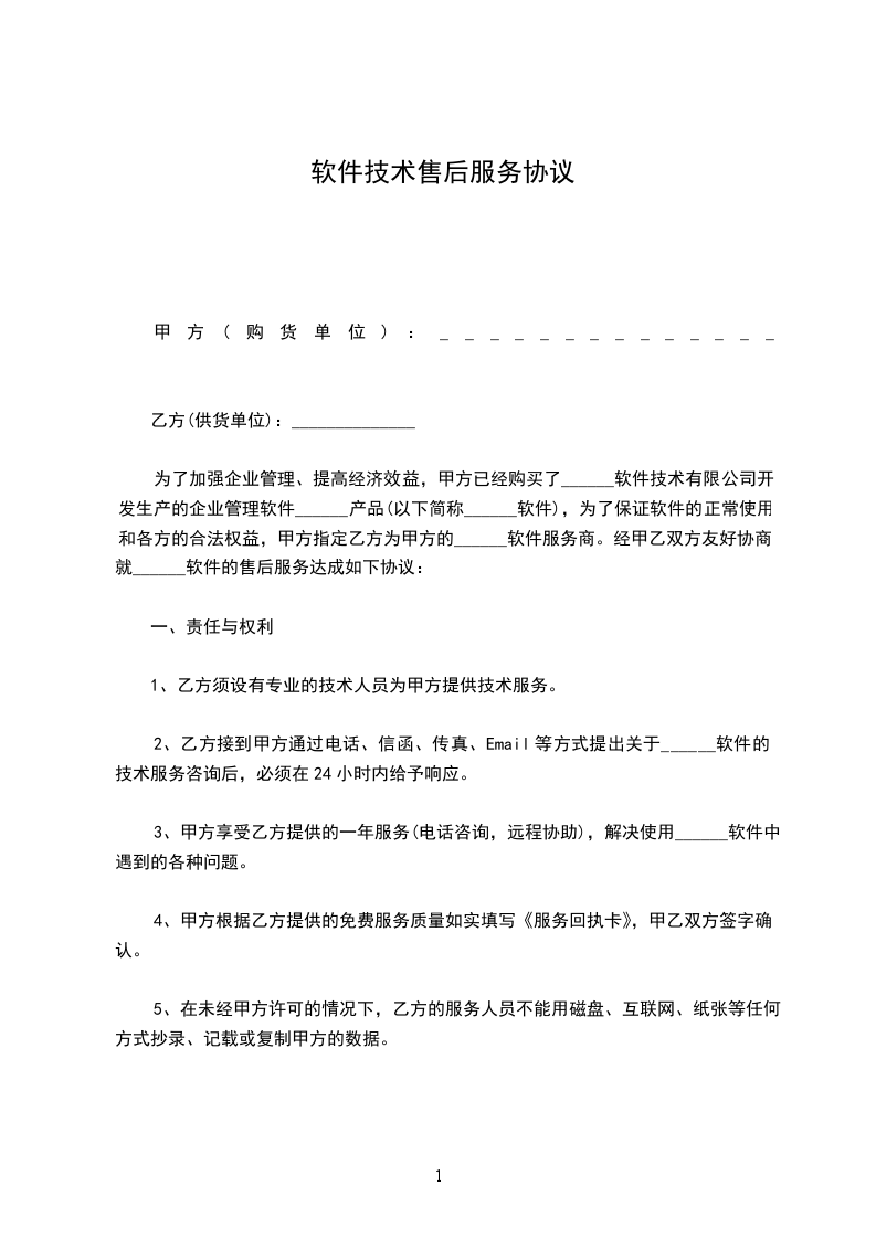 为了加强企业管理、提高经济效益,甲方已经购买了______软件技术有限公司开发生产的企业管理软件______产品(以下简称______软件),为了保证软件的正常使用和各方的合法权益,甲方指定乙方为甲方的______软件服务商。经甲乙双方友好协商,就______软件的售后服务达成如下协议:
