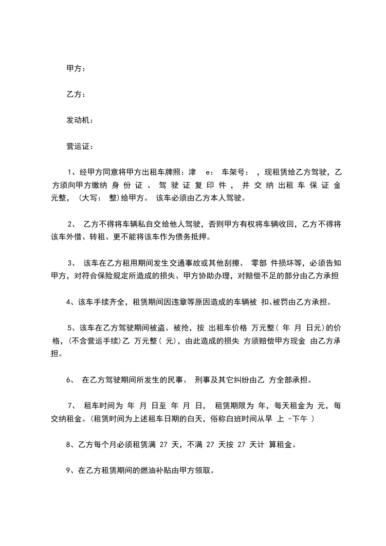 1、 经甲方同意将甲方出租车牌照: 津e: 车架号: ,现租赁给乙方驾驶,乙方须向甲方缴纳 身 份 证 、 驾 驶 证 复 印 件 , 并 交 纳 出租 车 保 证 金 元整, (大写: 整)给甲方。 该车必须由乙方本人驾驶。