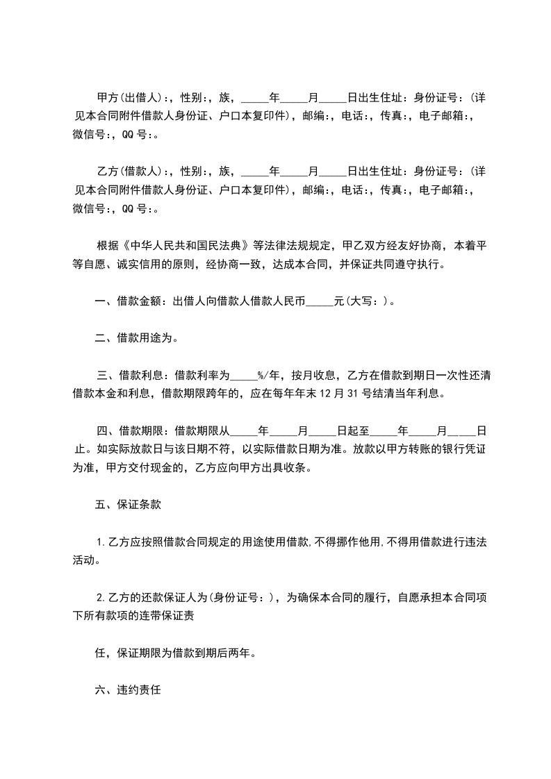 甲方(出借人):,性别:,族,_____年_____月_____日出生住址:身份证号:(详见本合同附件借款人身份证、户口本复印件),邮编:,电话:,传真:,电子邮箱:,微信号:,QQ号:。