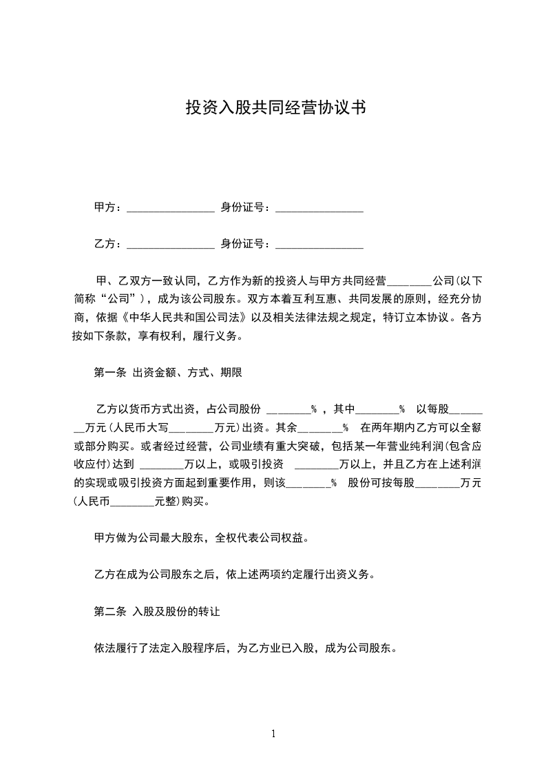 甲、乙双方一致认同,乙方作为新的投资人与甲方共同经营________公司(以下简称“公司”),成为该公司股东。双方本着互利互惠、共同发展的原则,经充分协商,依据《中华人民共和国公司法》以及相关法律法规之规定,特订立本协议。各方按如下条款,享有权利,履行义务。