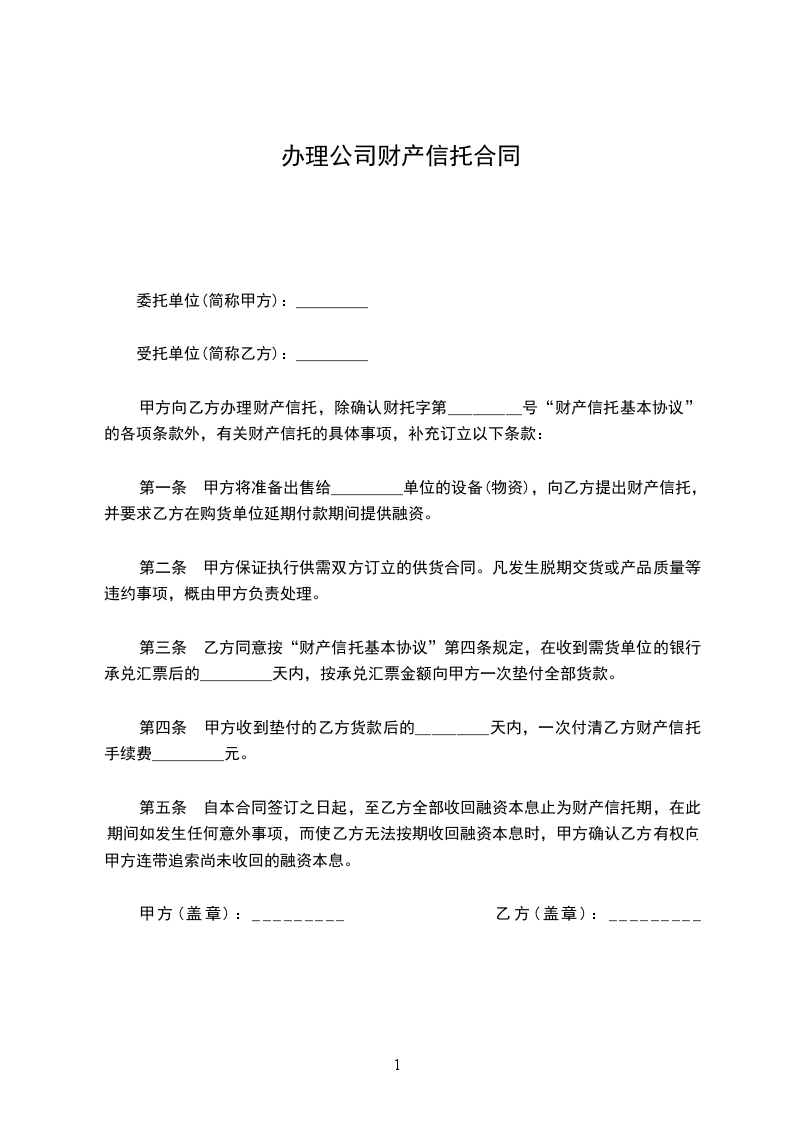 第一条 甲方将准备出售给_________单位的设备(物资),向乙方提出财产信托,并要求乙方在购货单位延期付款期间提供融资。